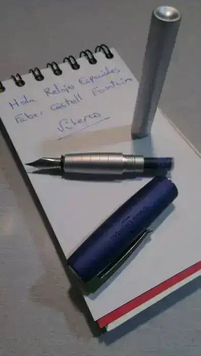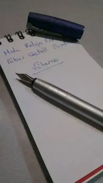 desde entonces, hace ya 15 días, no he parado de leer, de intentar comprender la terminología, de rebuscar plumas por casa (ha salido solo una de las malas, pero seguiré buscando) y hasta de mirar en tiendas, en un ataque de CRI, que llevo a hacerme con mi primera pluma, una Faber Castell Fountain. Realmente entre al corte Inglés preguntando por una Lamy Safari o una All Star, pero no tenían, y la chica, muy avispada ella y curtida en batallas de CRI, me indujo a mirar algo económico y, según me dijo, un poco mejor que la Lamy (esto ya os lo dejo a vosotros), la mencionada Faber Castell Fountain con punto F, que se me quedó por cerca de los 30 €...