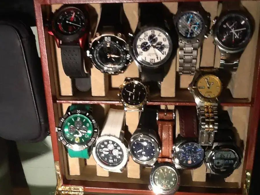 destaco, como curiosidad, un SEIKO que no me pongo por el diseño y pequeño tamaño, el reloj ruso que compré a un ruso en Peñíscola en 1993, de cuerda , un Racer de Titanio que es una maravilla , un GUESS que me va de cine desde 1999, un Swiss Military cuya correa se ha estropeado y mejor no pregunto el precio y poco mas... El resto basurilla, jajajaj