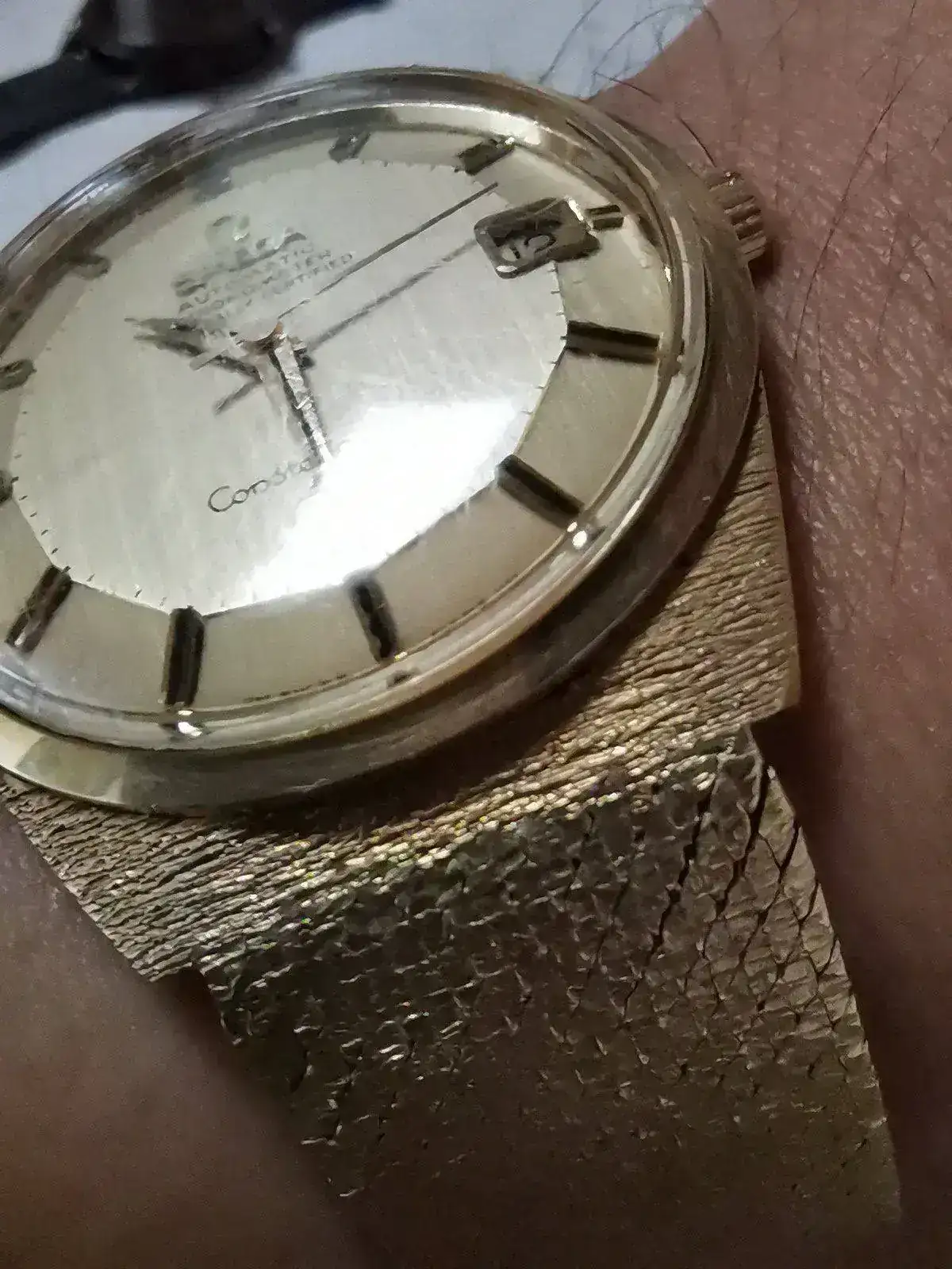 Hola buenas tardes, soy nuevo en esta pagina y quisiera que uds como conocedores me ayuden a saber mas del Reloj que era de mi padre es un Omega Constellation de Oro de 18kts, nose que movimiento es ni nada les adjunto estas fotos y si me pueden dar mas información se los agradecería muchísimo, ya que he tratado de encontrar imágenes de otros como el y no encuentro otro que tenga un brazalete que sea uno solo con la caja, espero me puedan ayudar. Saludos