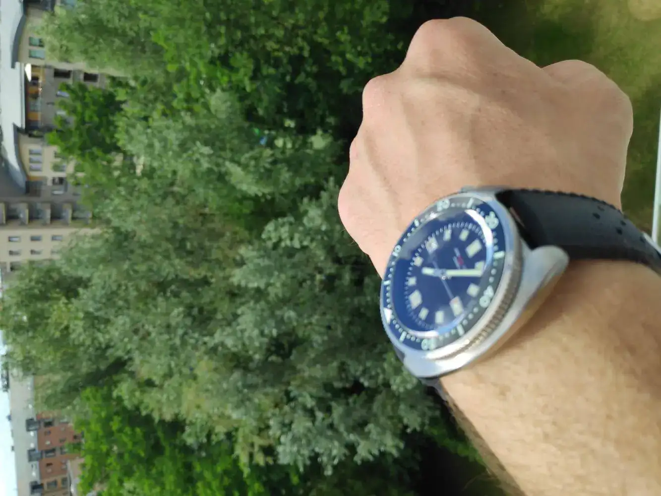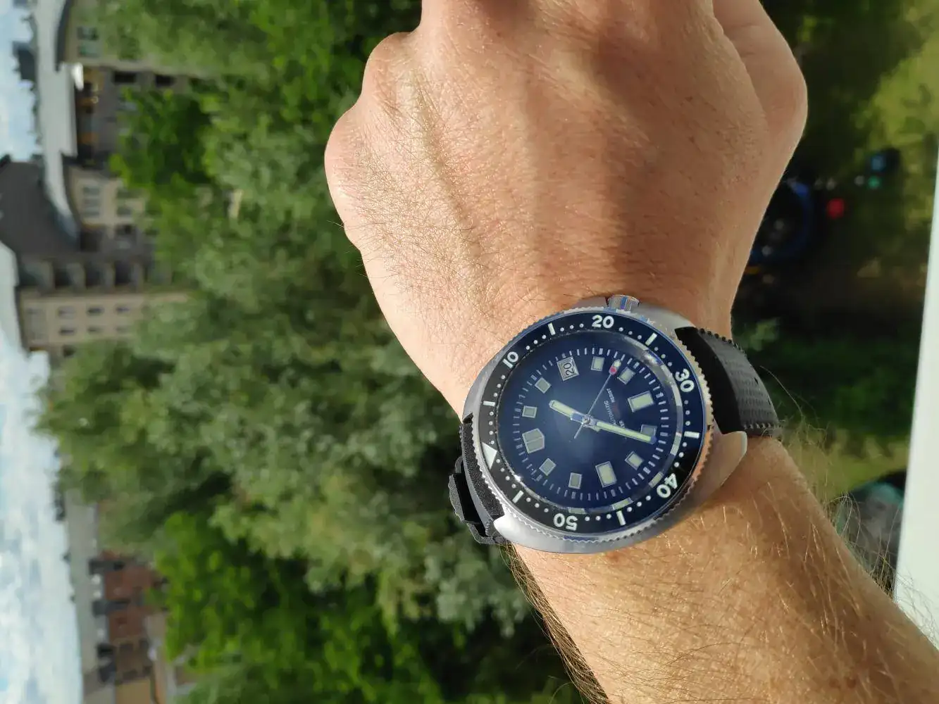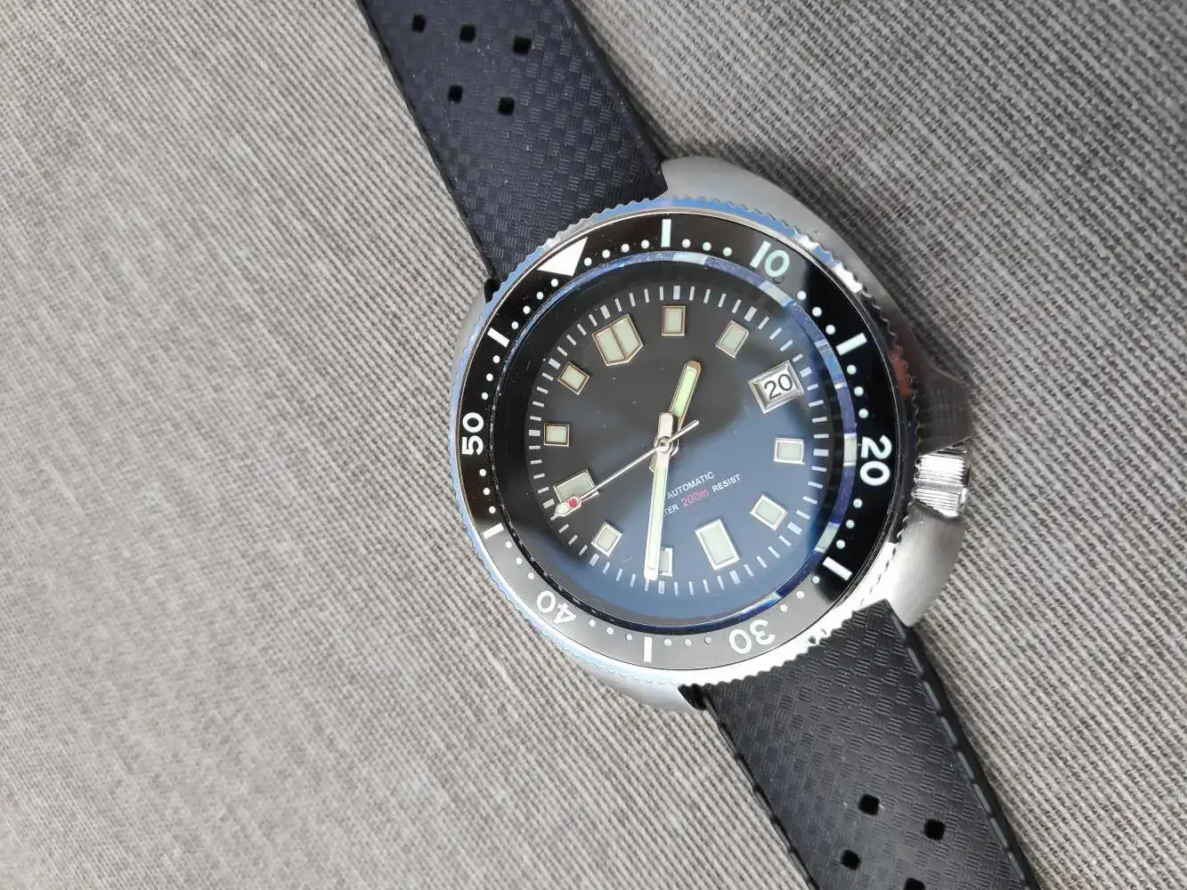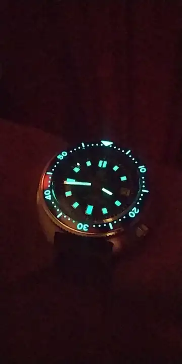Y luego un par de asuntos estéticos, muy menores (por buscarle alguna pega, mayormente) que yo cambiaría: la forma de la caja parece ser un pelo más estrecha que en el 6105 original, me hubiera gustado que fuera de las mismas dimensiones exactas, ya que lo que más me gusta de este modelo es precisamente esa caja tan ancha. Pero en verdad es algo común a todas las reediciones, incluida la que acaba de lanzar Seiko, y es muy poca la diferencia. Además, el reborde metálico de los marcadores en la esfera, dependiendo de cómo incida la luz, me parece que tira demasiado al dorado, hubiera preferido un color más claro.