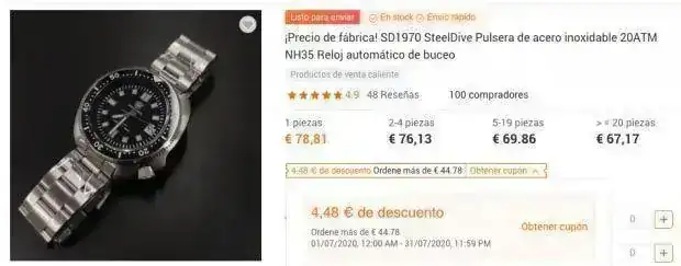 Este tiene el cristal de zafiro que sobresale del bisel y con una capa de antireflejante interior azulado. Demasiado azulado para mí gusto. El bisel no trae perla porque es cerámico y con todos los números con lumen azulado. Además tanto la corona como la trasera llevan el logo de la marca.jejeje, si bueno me refería si había que hacer algo especial, he probado y ya veo que con darle a "obtener cupón" ya se hace el descuento automáticamente.