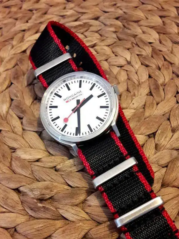 Yo la veo súper deportiva esa correa , y súper moderna además va a juego con las agujas y el triángulo rojo que hay a las 12 , vamos es perfecta
