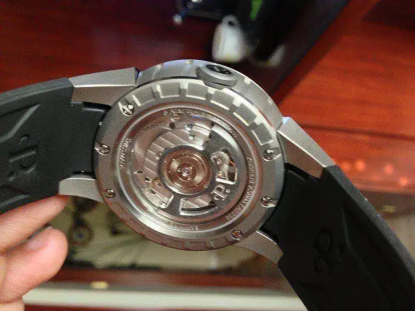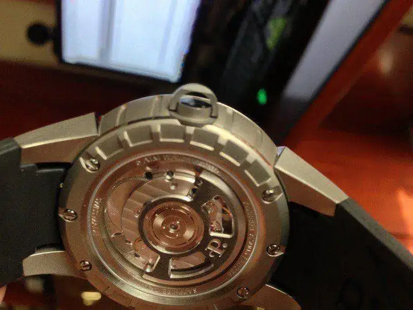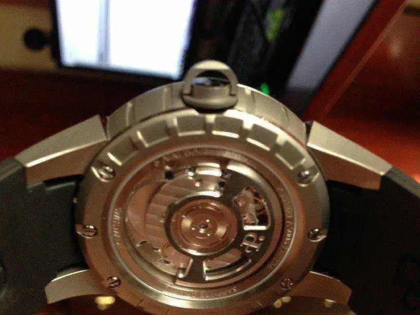 El calibres es el automatico P-181 de 21 rubies y 40 horas de reserva. Caja de 44mm, altura 12,8. La corona tiene una pequeña asa para extraerla y poner el reloj en hora, cuando dicha asa se pliega queda integrada en la corona, una vez puesto en hora la corona se pulsa y queda integrada en la caja. El bisel interior es negro con indices luminiscentes (así como las agujas) y queda por encima de la turbina (rotor superior que aumenta un 25% la carga).