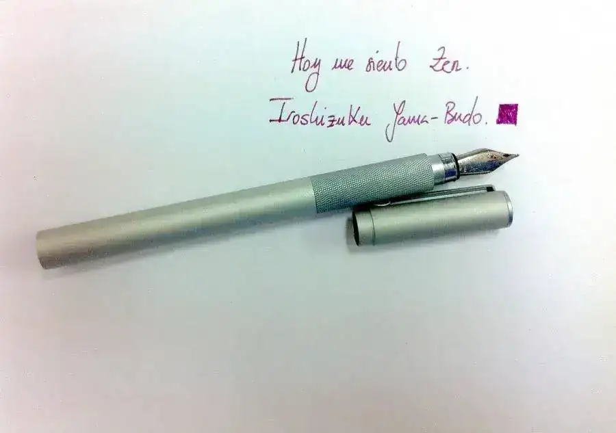 Pues hoy han llegado las dos, tinta y pluma. Sólo la he probado a modo de palillero. Reservaré esta tinta para puntos más gruesos (éste es M) y plumas más vistosas porque la verdad es que el color me parece, cuando menos, especial.