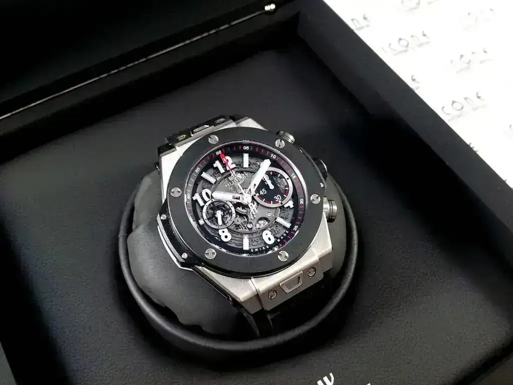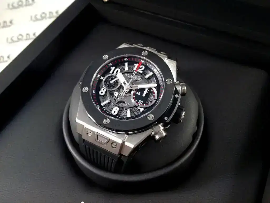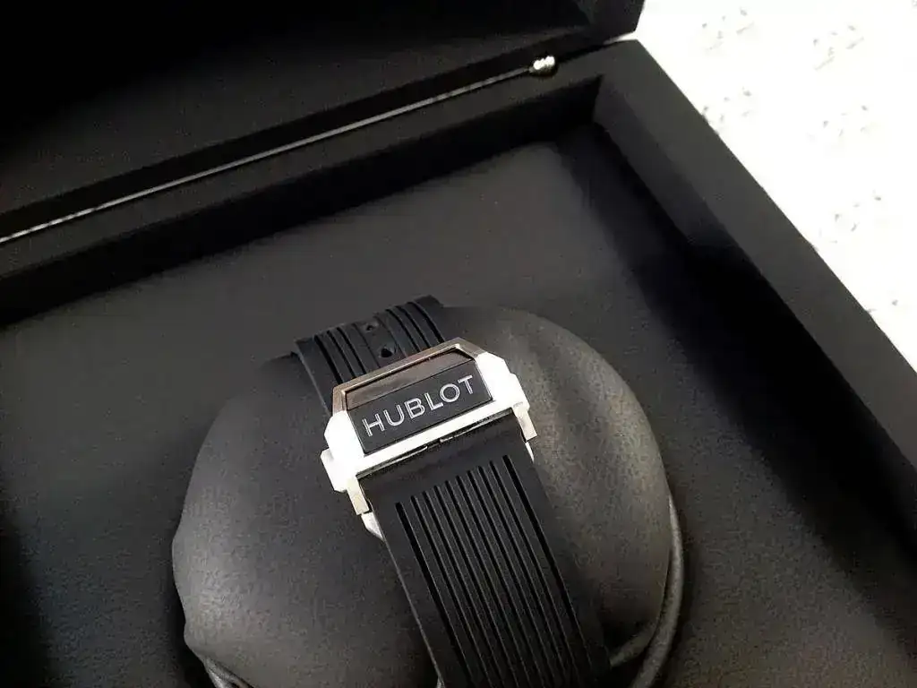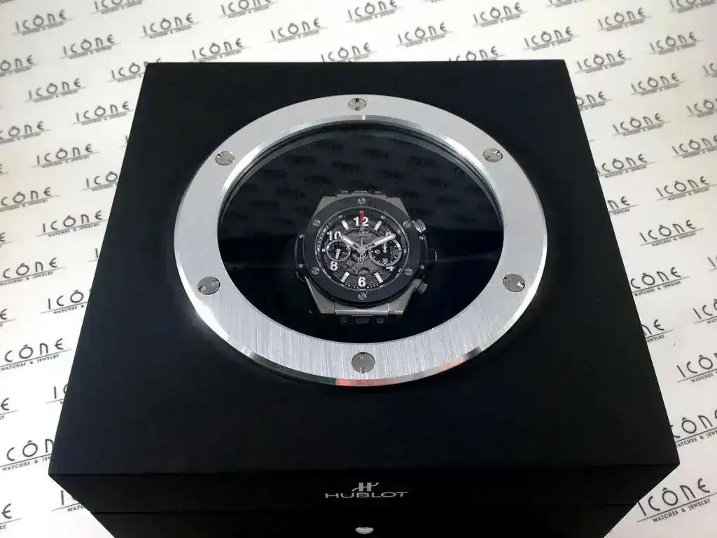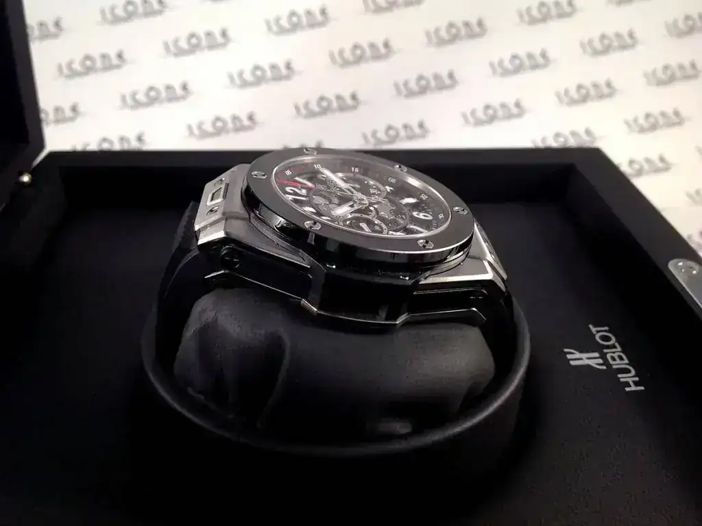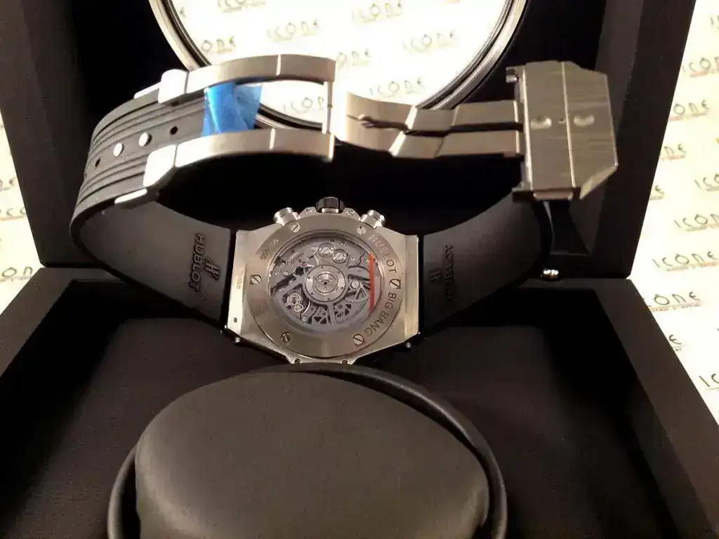 Las características son: Reloj automático cronógrafo flyback con movimiento HUB1242 Unico Self-winding con caja de titanio satinado de 45mm., bisel de cerámica negra, brazalete de caucho con cierre desplegable Hublot, cristal de zafiro anti-reflejante, reserva de marcha de 72h.