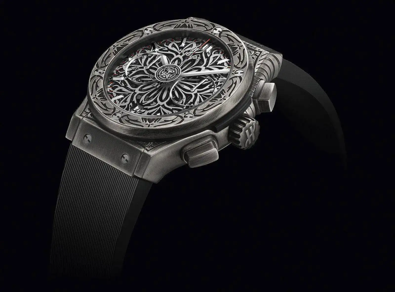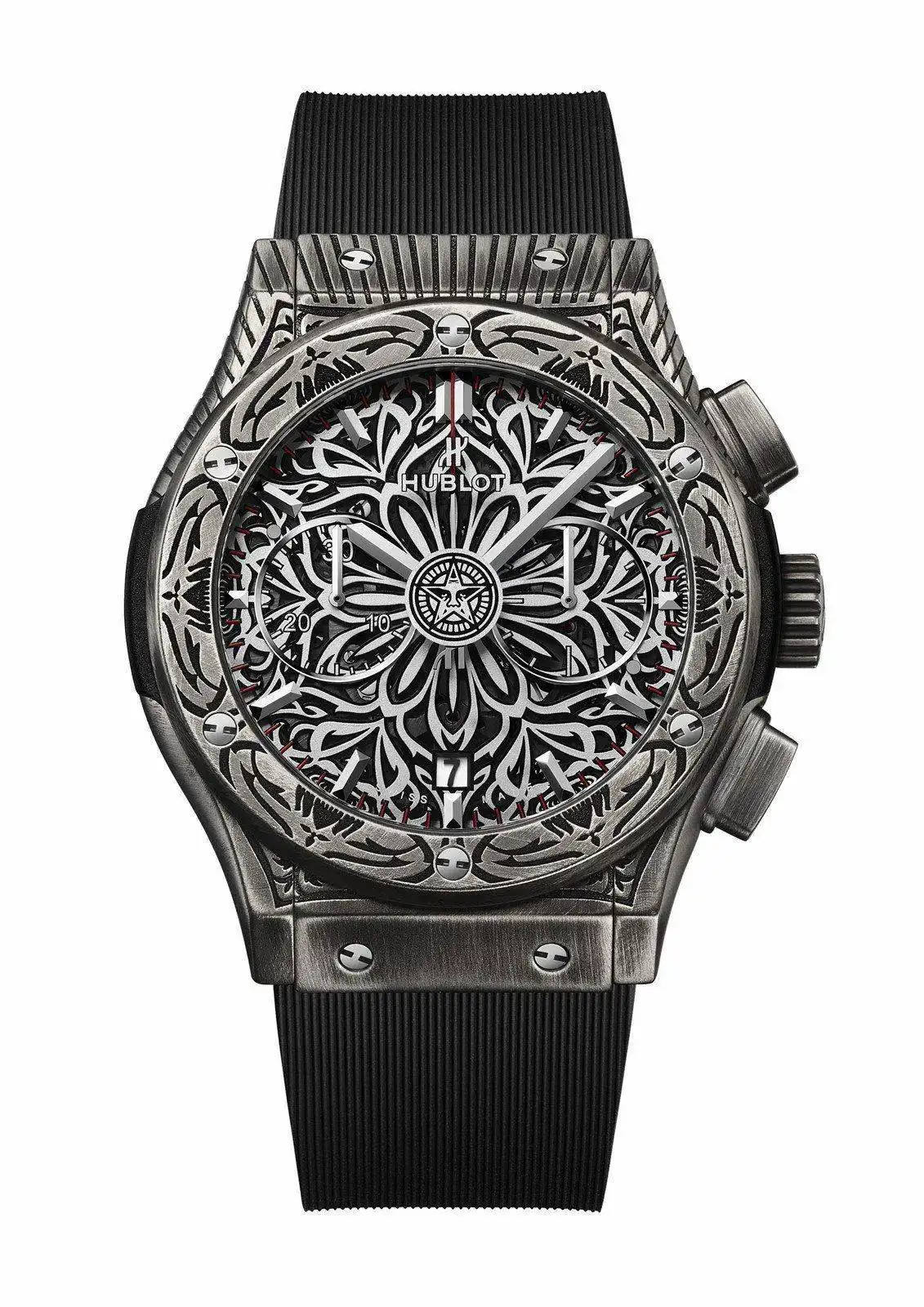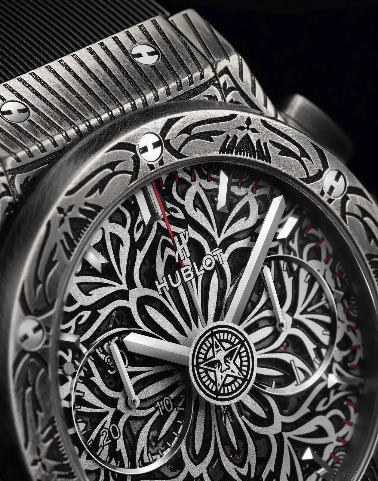 Para esta segunda colaboración Shepard Fairey escogió como base un reloj de la colección Classic Fusion. El artista estadounidense decidió dar vida a una pieza que simboliza un mandala, que representa armonía, el ciclo de la vida y los elementos, así como la naturaleza preciosa del tiempo en la mente. En este ejemplar, el patrón del mandala se ha grabado y pulido en titanio, material empleado también para crear el bisel y la caja de 45 mm. El trabajo prosigue en la esfera, que también se ha cincelado para exhibir el movimiento cronógrafo de carga automática, un calibre HUB1155 que ofrece una reserva de marcha de 42 horas. En el centro del reloj, las agujas muestran la «Star Gear» de Fairey.