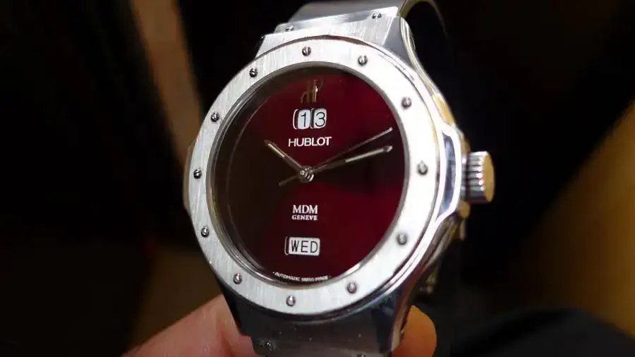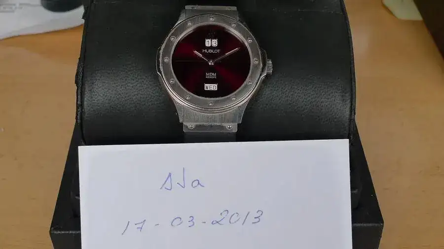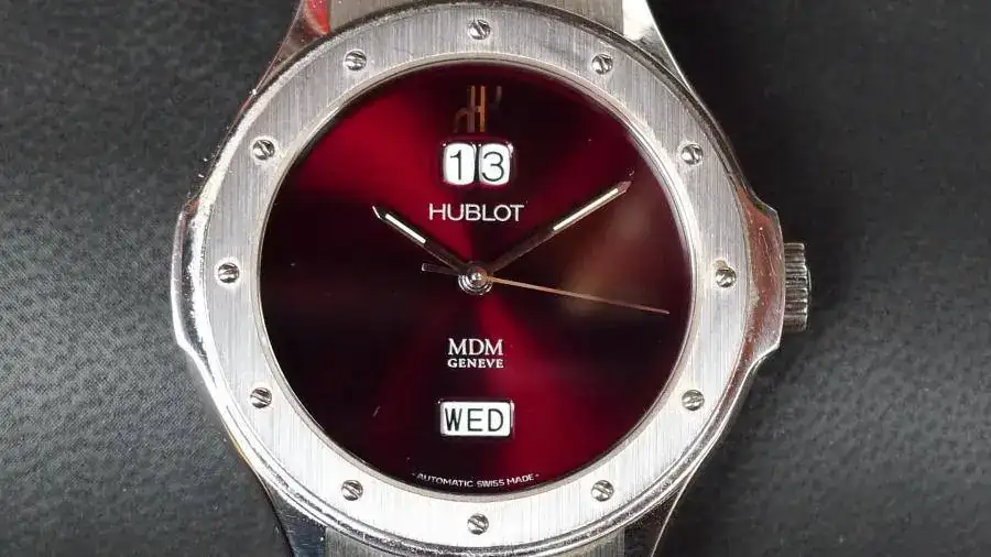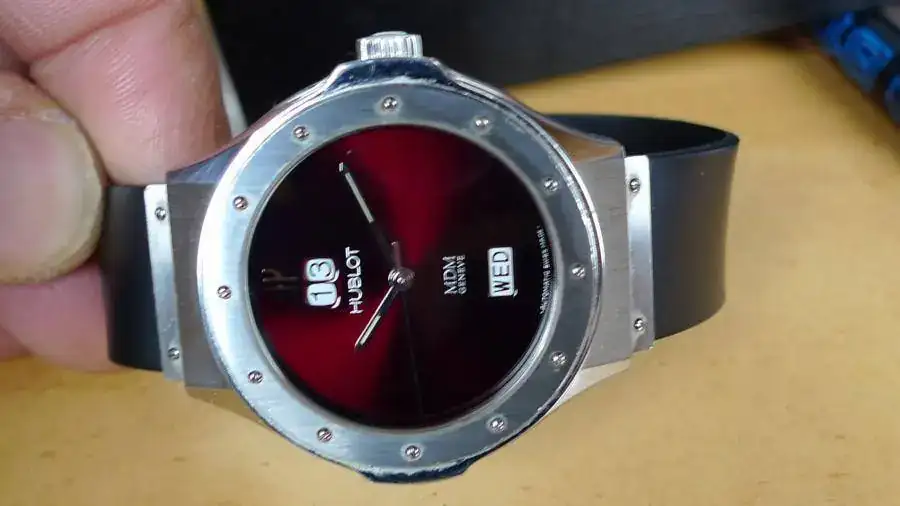 Preicosa esfera color vino, y tipica caja hublot de 39mm de diametro sin contar la corona