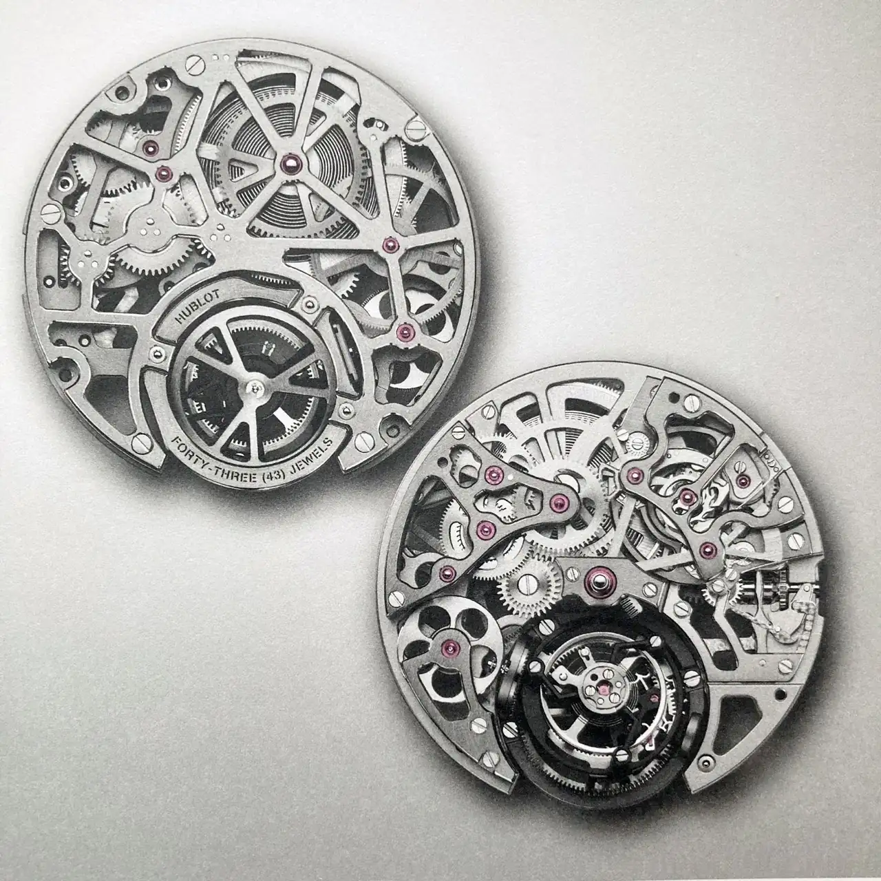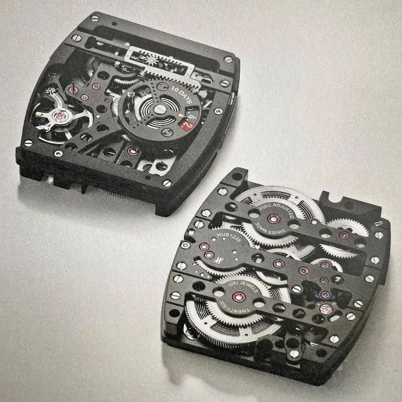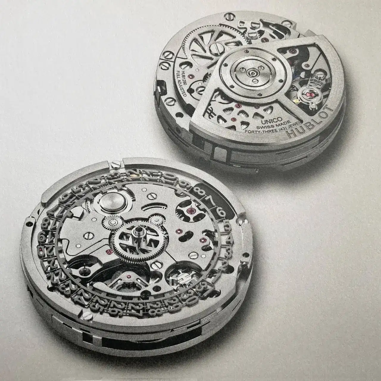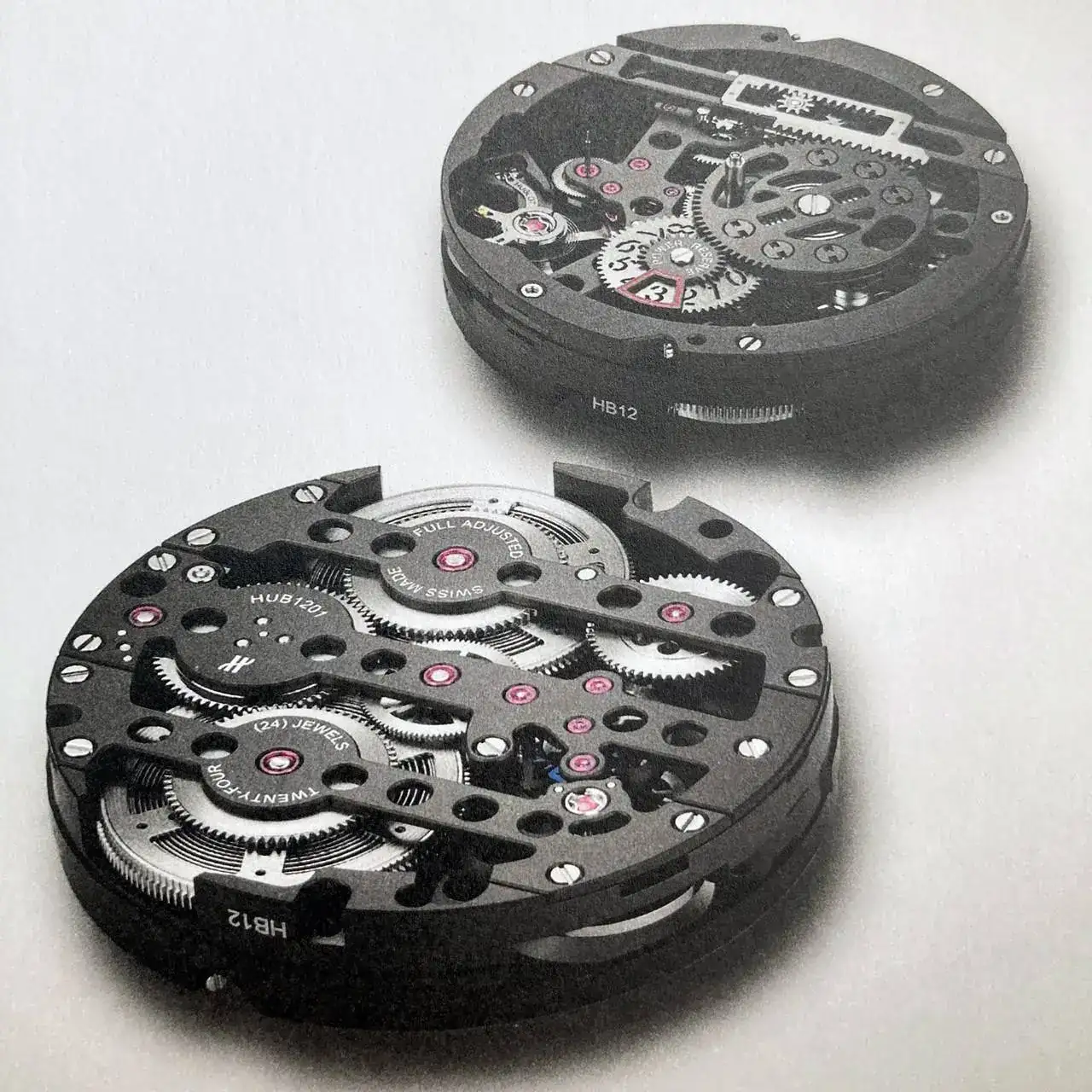 O los calibres propios. Siete creaciones 100% in-house -de momento-, que abarcan desde el cronógrafo Unico HUB1280 hasta el sofisticado HUB9011, con 14 días de reserva de marcha gracias a sus 7 barriletes engranados en serie. Dos tourbillones (uno biaxial), dos con forma de tonel para el Spirit of Big Bang y dos calibres ajenos, para la colección Classic Fussion, suministrados por Sellita según las especificaciones de Hublot.