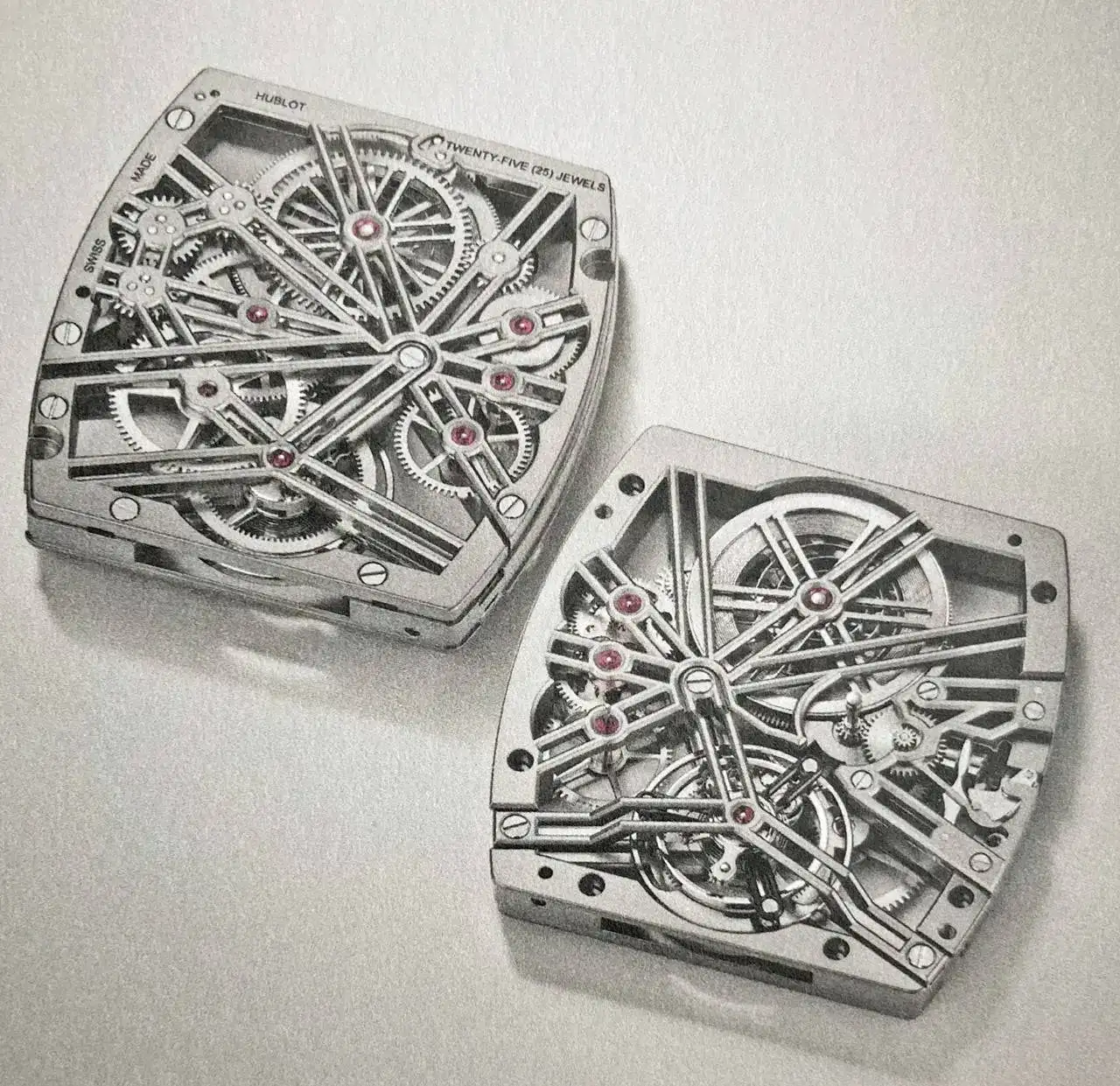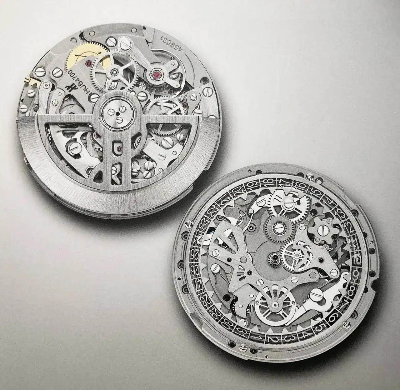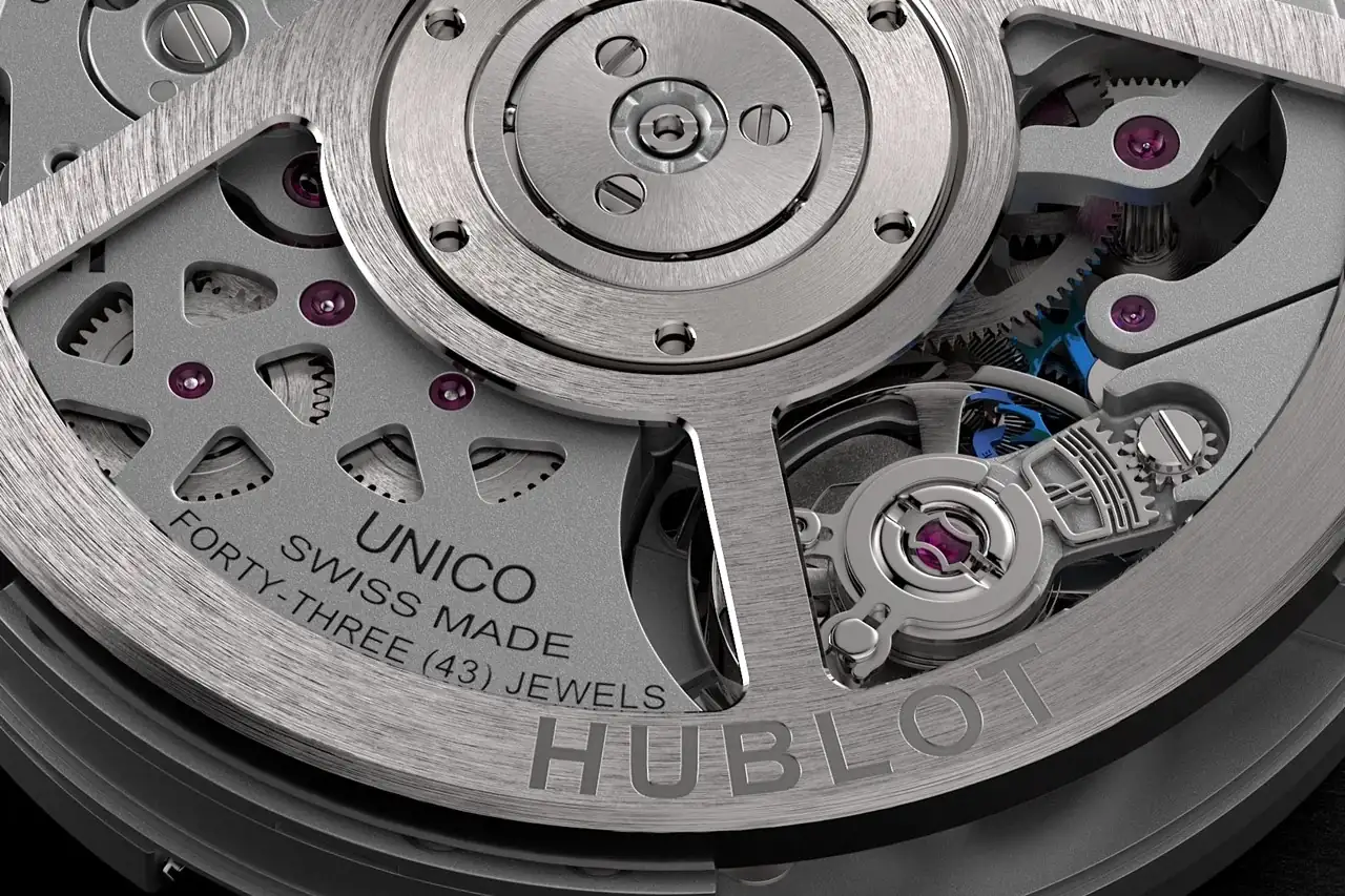 O los calibres propios. Siete creaciones 100% in-house -de momento-, que abarcan desde el cronógrafo Unico HUB1280 hasta el sofisticado HUB9011, con 14 días de reserva de marcha gracias a sus 7 barriletes engranados en serie. Dos tourbillones (uno biaxial), dos con forma de tonel para el Spirit of Big Bang y dos calibres ajenos, para la colección Classic Fussion, suministrados por Sellita según las especificaciones de Hublot.