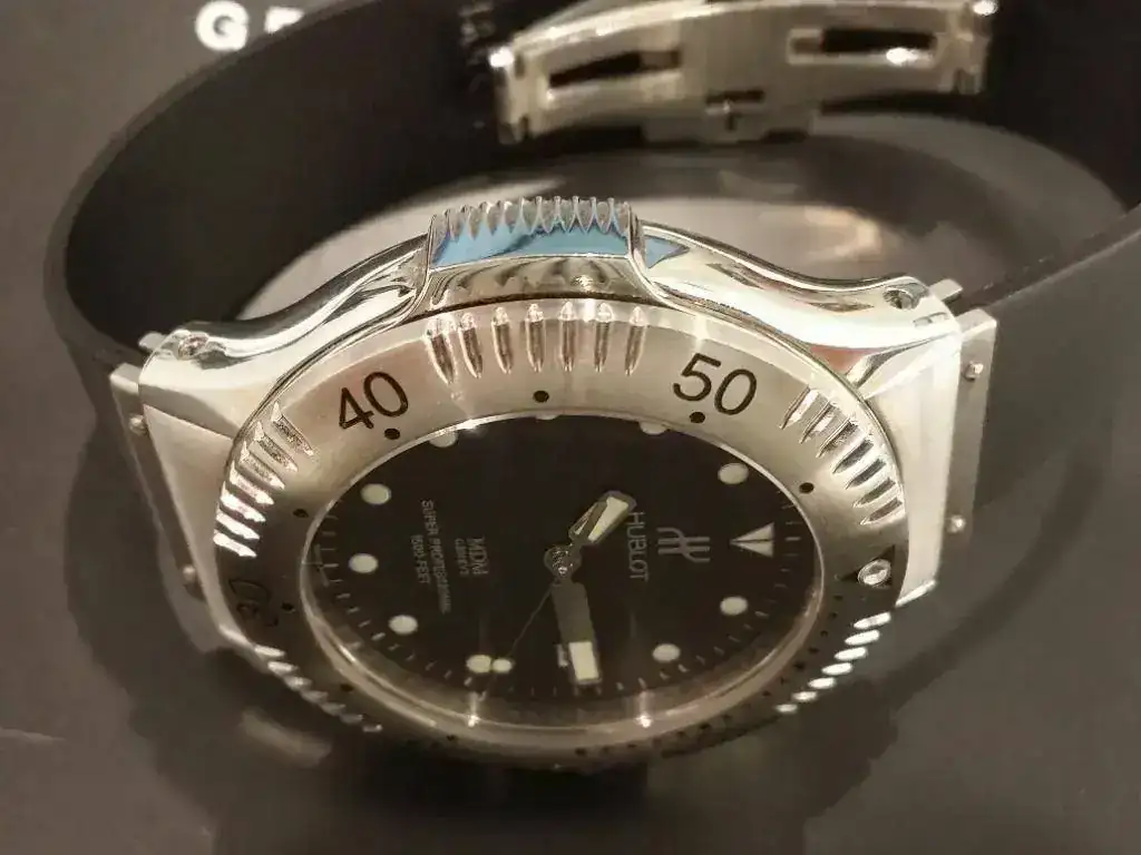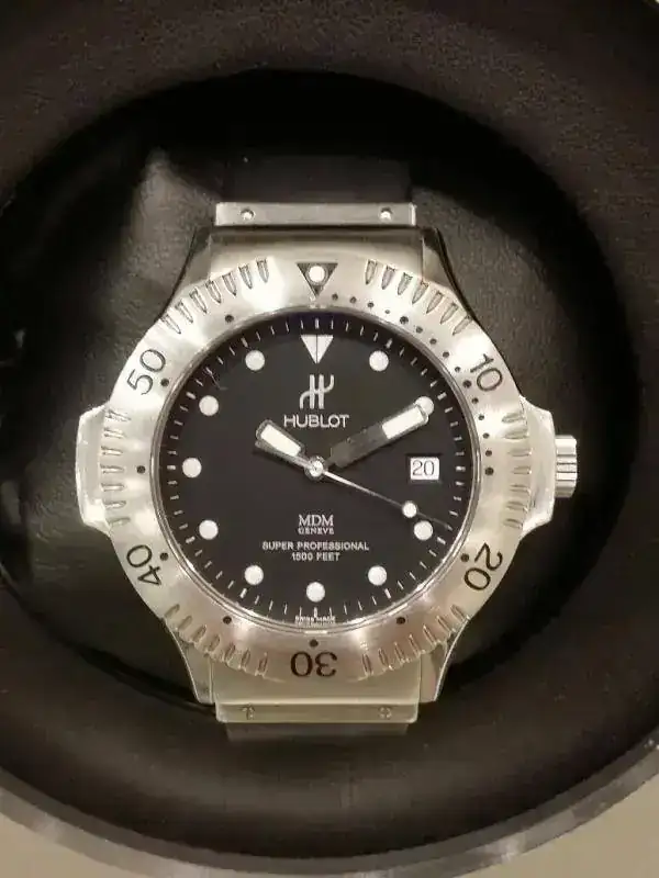 Vendo Hublot Superprofessional 1500FT Acero 40mm sistema de bloqueo del bisel, segundero central, fecha a las tres, luminiscencia, corona a rosca.