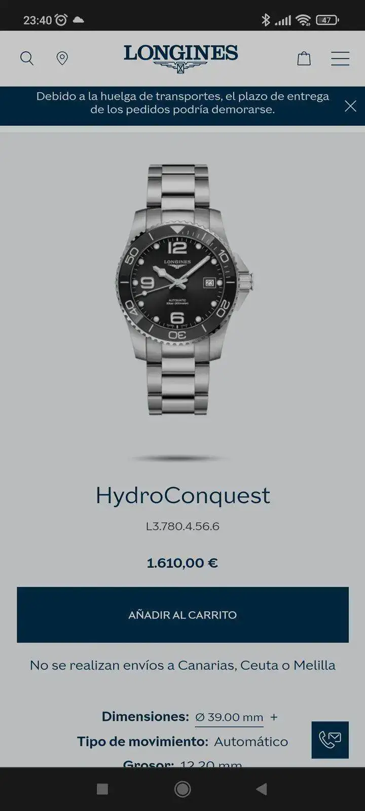 A mí me gustaría porbarmelo por ver el tamaño, pinta muy bien, es verdad que con esas asas los Longines aparentan más de su medida.Tú sabes que he tenido él de 41 en tres versiones distintas, y con muñeca de 17,5 o poquito más, me lo veía grande. O al menos, tenía claro que más pequeño me gustaría más, igual que me pasó con el Conquest Sport. Estos relojes, entre el guardacoronas y la afición de Longines por las asas largas, visualmente aparentan bastante más tamaño del que deberían tener por el diámetro de su caja.