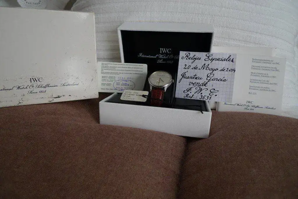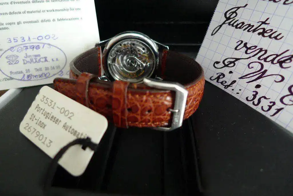 Saco a la venta este precioso reloj IWC Ref. 3531/002 denominado "pequeño portugués" automático, en acero con correa de cocodrilo marrón y fondo visto, lo compré en el año 2.000 como puede verse en la tarjeta de garantía en C.O. de Vitoria y dispone de toda su dotación completa.