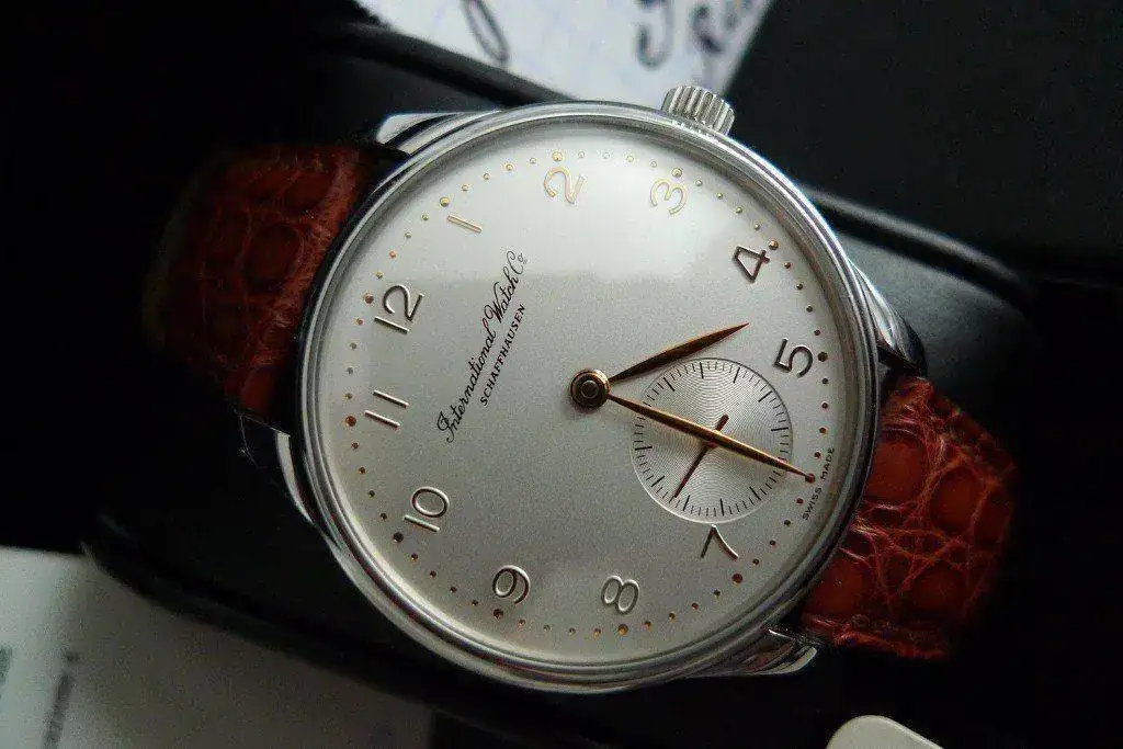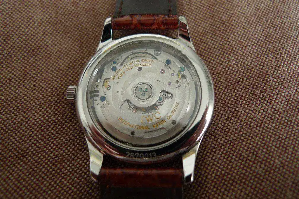 Lleva un maravilloso calibre Jaeger-Lecoultre marcado por IWC (según tengo entendido) que se puede contemplar a través de su fondo visto.