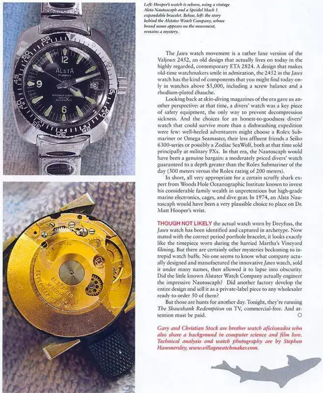 Iba a pedir ayuda para que me ayudaseis a identificar un diver vintage, concretamente uno que sale en la película tiburón. he hecho una captura de pantalla con el móvil y en un foro hermano he encontrado esto, así que el misterio ya esta resuelto pero me gustaría compartirlo con vosotros. Precioso por cierto el Alsta, todo un 300m...