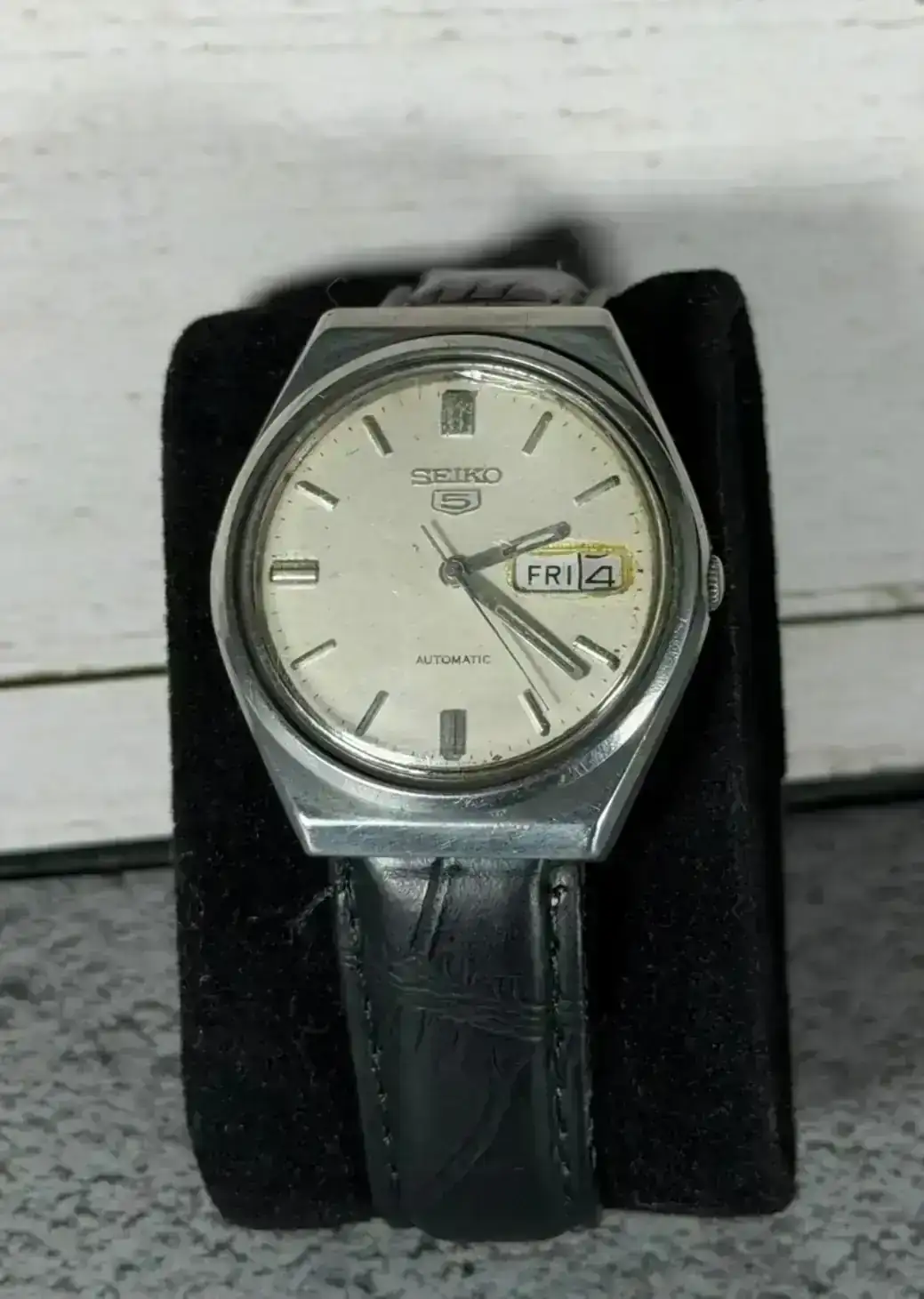 recambio japonés de los años 70, pensado para montar un calibre Seiko automático y equipado con un cristal ovalado facetado característico de ese tipo de suministros.