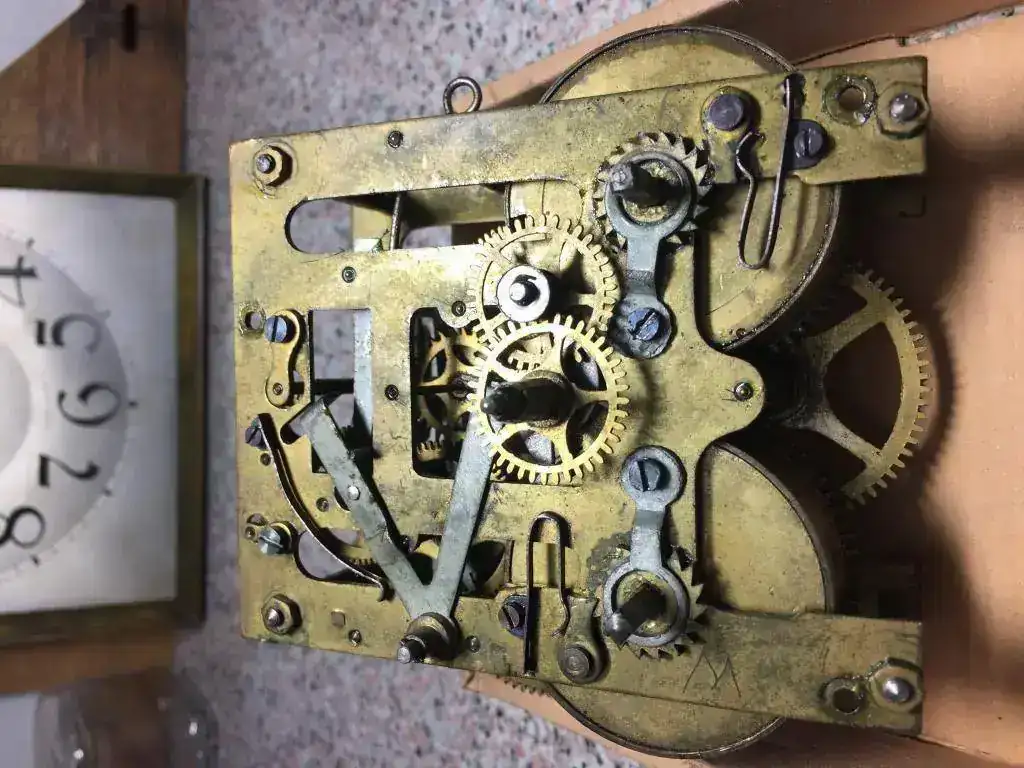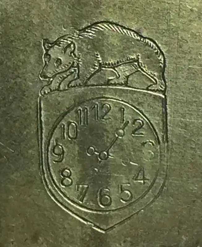El movimiento es bastante sencillo, pongo fotos más abajo, y únicamente lleva grabados “made in switzerland”, los números 44 (imagino que la longitud del péndulo), 679 (imagino que el movimiento) y un sello de un oso sobre un reloj que marca las 3:07 o algo parecido, del que no he podido encontrar información por internet.