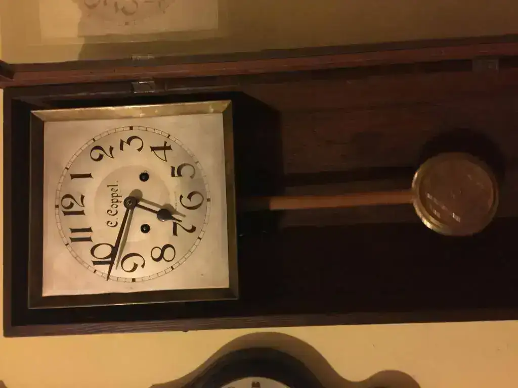 Estoy resucitando un viejo reloj montado por Carlos Coppel hace un siglo. A parte de una importante cantidad de suciedad y aceite seco, una cuerda mal y problemas con la suspensión del péndulo, por lo demás está en un estado bastante aceptable y desde anoche ya está en marcha a la espera de una restauración cosmética de la caja.