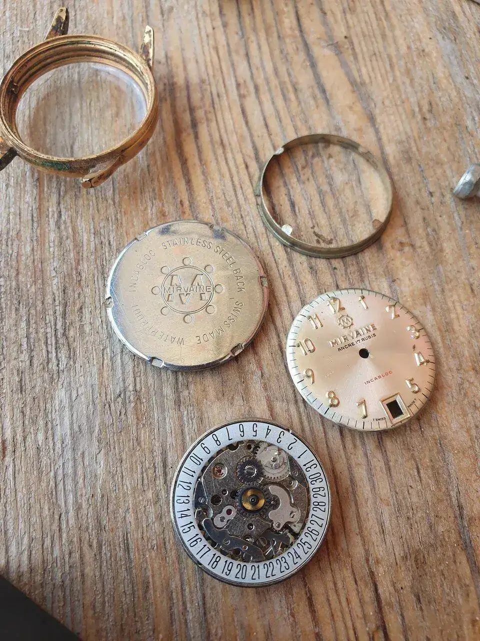 Creo que el movimiento mide 32mm, pero os lo confirmo, en el dial lleva la "marca" Mirvaine, debajo de las agujas Incabloc, y en el propio movimiento sólo lleva inscrito 17 rubis.