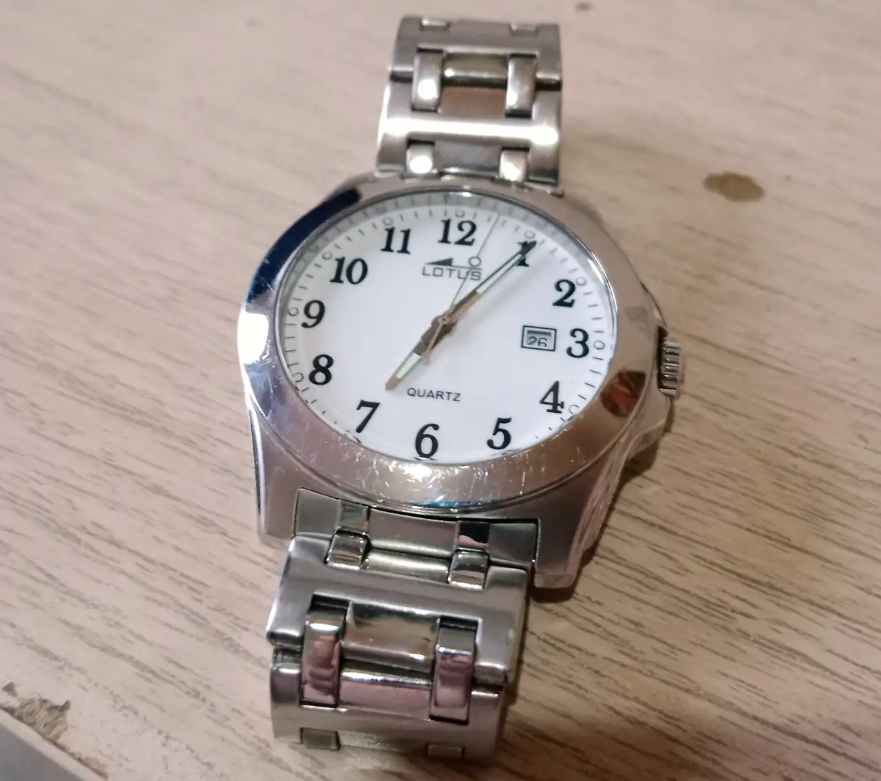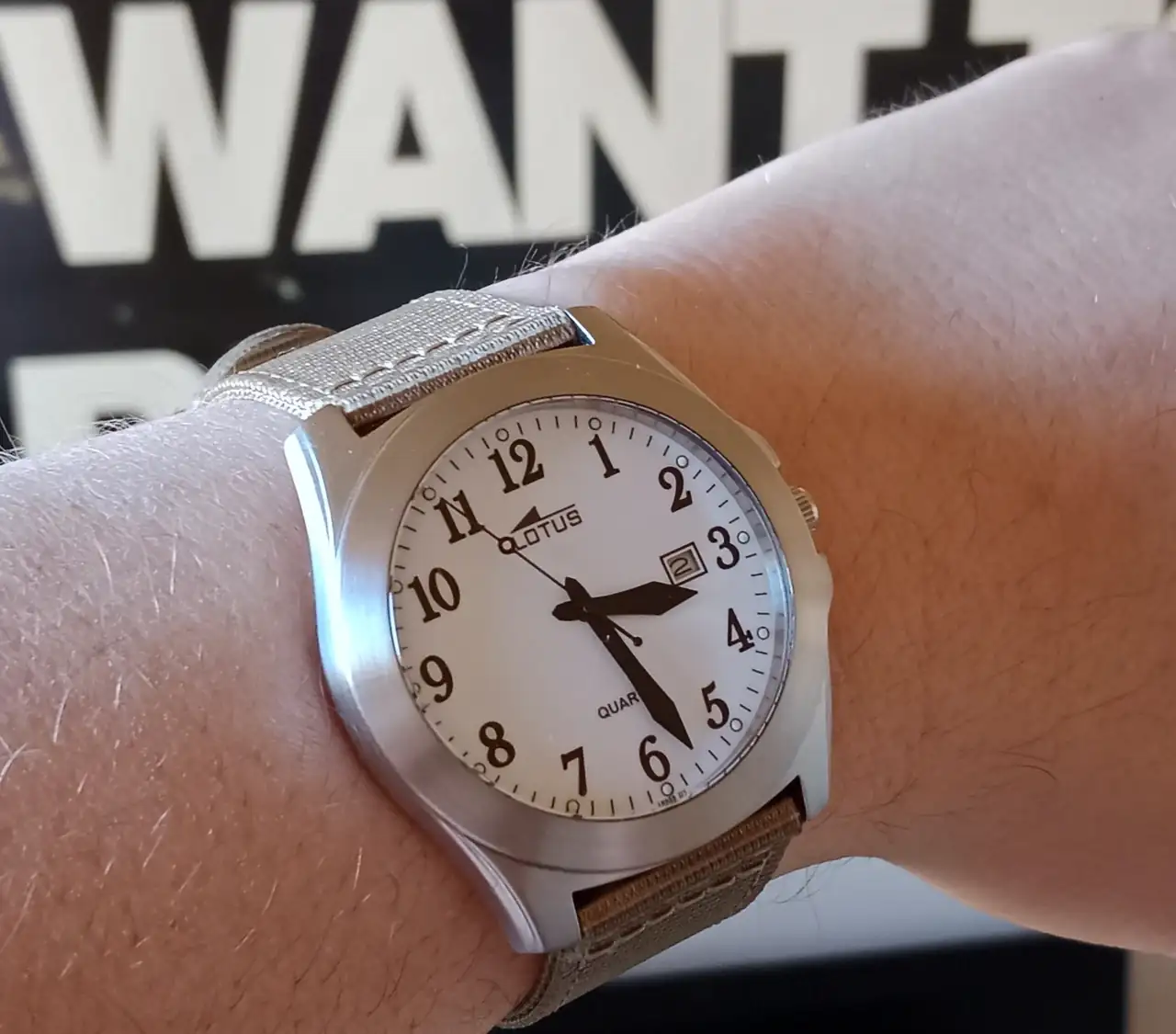 este insulso Lotus, que además tenía el problema de una corona tan grande que tendía a engancharse y salirse cada 2X3.. total, le cepillé la caja, le cambié las agujas (éstas NO son las famosas agujas británicas) por unas más acordes con esos números viejunos y un poco ... no sé..., le puse una corona y tija nuevas, corona menos saliente, y le he plantado una correa textil caqui...: