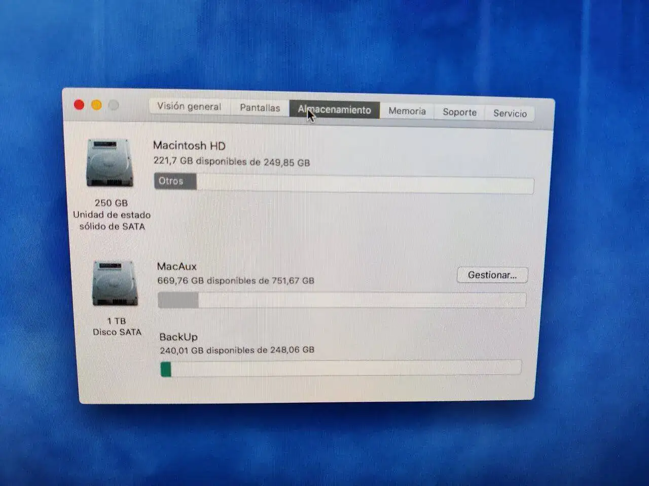 Sin superdrive, se le sustituyó por el SSD de 256 que está puesto como disco de arranque y el de 1Tb para almacenamiento.