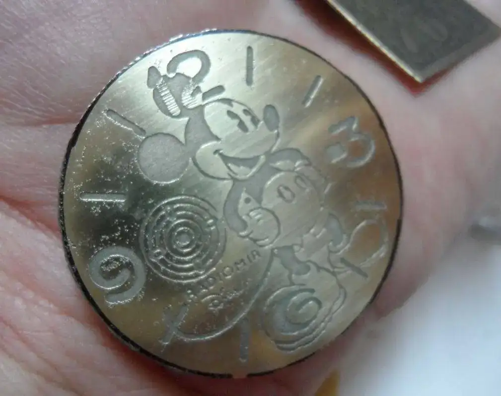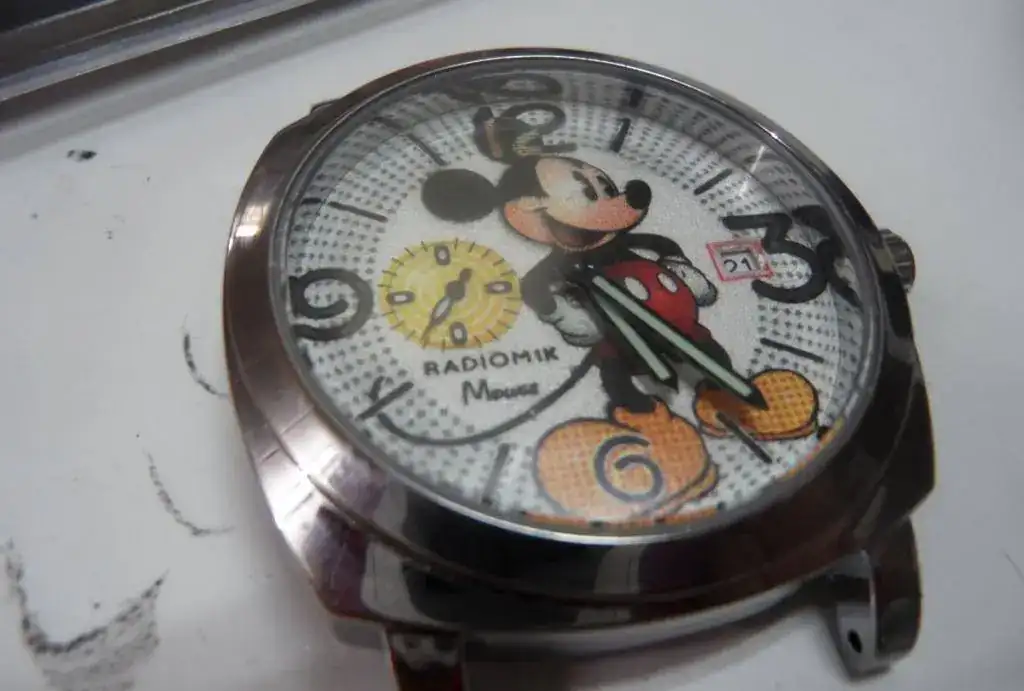 Así que como no me gustaba, limpié de rotulos la esfera del reloj y le he serigrafiado directamente el mickey a color y barnizado con esmalte en frio incoloro para protejer los colores.... este es el resultado