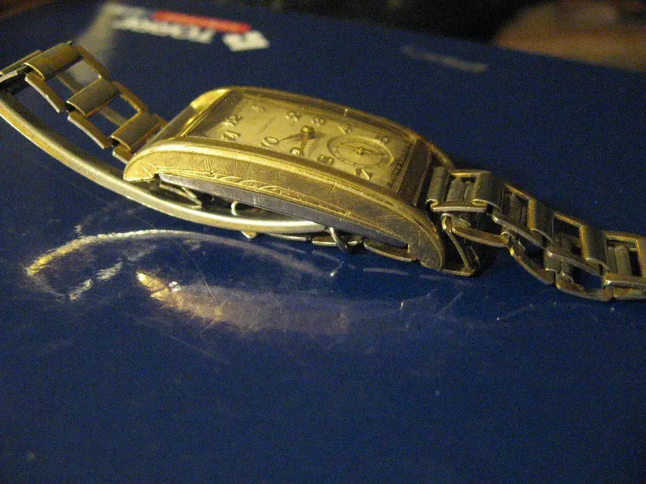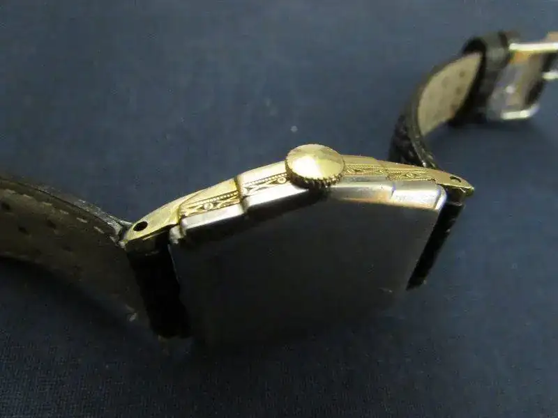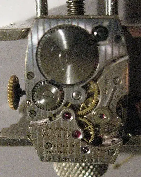 En este reloj , de la marca Tavannes ( relacionada con Cyma) se llevó la idea al extremo de alargar la caja del reloj a una forma rectangular, 2:1 , doble de largo que el ancho) , con los consiguientes problemas de largo de las agujas que, manifiestamente marcan muy bien en las zonas ecuatoriales de la esfera pero, no son legibles hacia los extremos polares ( de 10 a 14 hrs. Por ejemplo la lectura minutera resulta imposible de precisar directamente…). Sus numerales horarios son manifiestamente del tipo Breguet , muy sobresalientes en una suerte de escalerilla lateral a ambos costados de la longitud del rectángulo de la esfera..