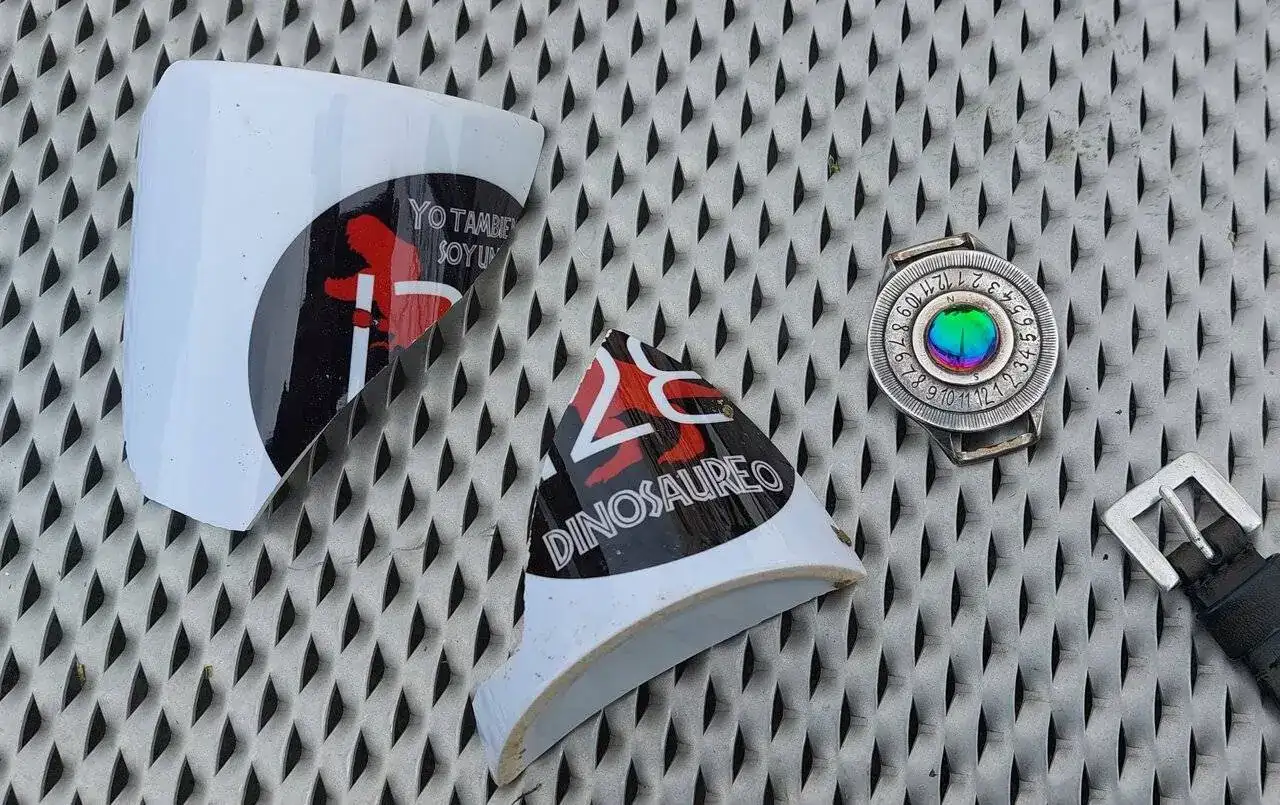Se trata de unos fragmentos de contenedor de fluidos de cerámica china decorada con extraños símbolos, un artefacto rudimentario para medir el tiempo cuando aún la atmósfera estaba limpia, y una antigua correa de piel de la ya extinguida vacalada.