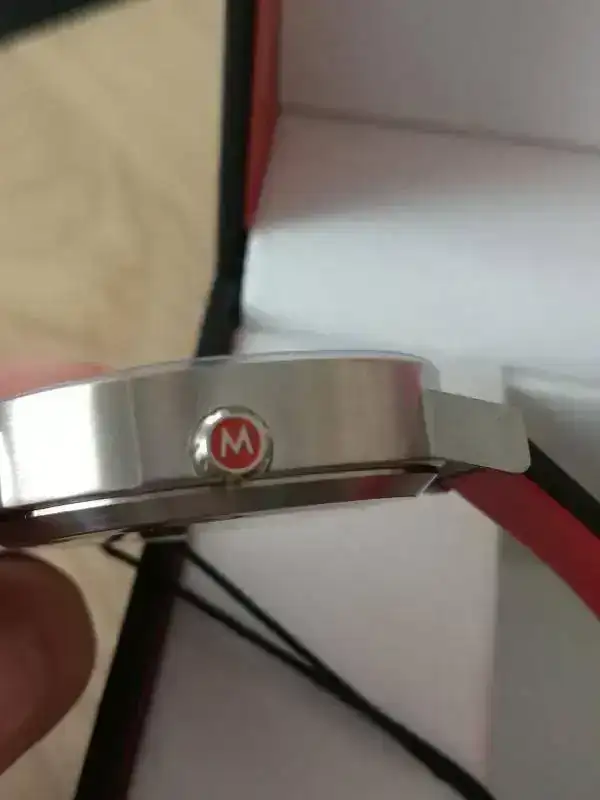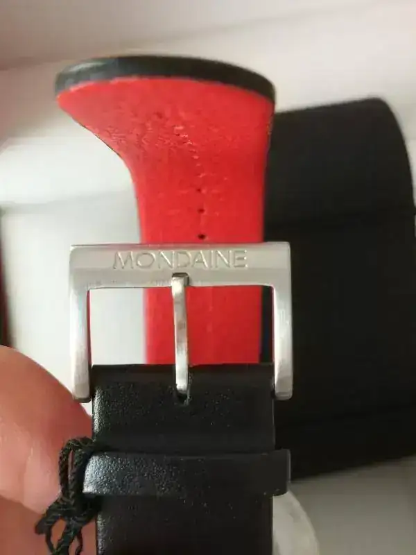 Su correa de piel negra con el interior rojo le queda de maravilla, aportando un ligero toque sport a un reloj sobrio y elegante. Tiene un cierre de hebilla de acero con el grabado de la marca.