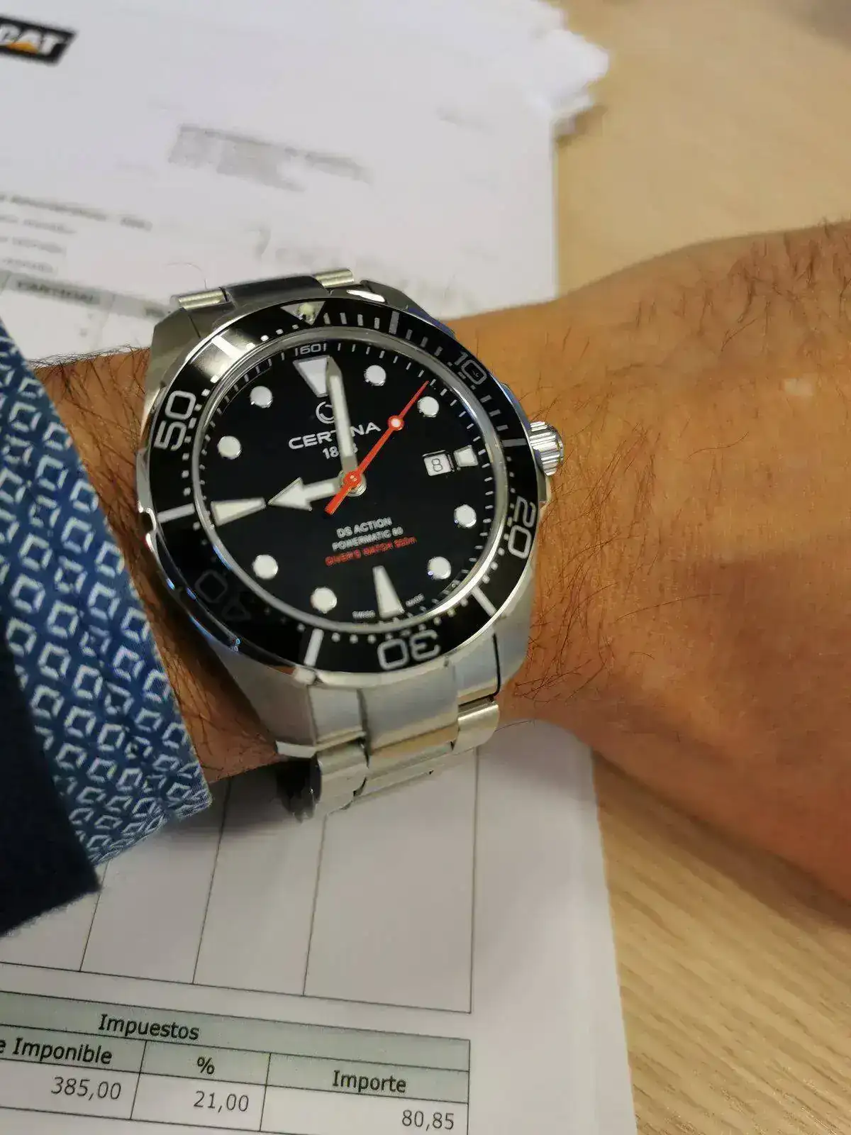 Desde hace una semana tengo el Certina Ds Diver con Powermatic 80. Descambie uno que tenía el 2824- 2 porque no iba muy fino. No voy a hacer una presentación al uso, porque es muy conocido el modelo. Había leido cosas sobre su precisión , pero me ha dejado alucinado. Tras una semana justa está en 0,0 . No ha adelantado ni atrasado nada en 7 días. Decir que cuando lo uso me adelanta unas 2 décimas día y se compensa por la noche boca arriba . No he jugado con las posiciones. Tengo un Seiko con 7s36 que jugando con posturas esta entre +3-5 segundos y varios rusos también en esos márgenes jugando con las posiciones y tras tocar yo mismo la raqueta, pero el Certina es muy estable y apenas le influye la posición . Estoy sorprendido.