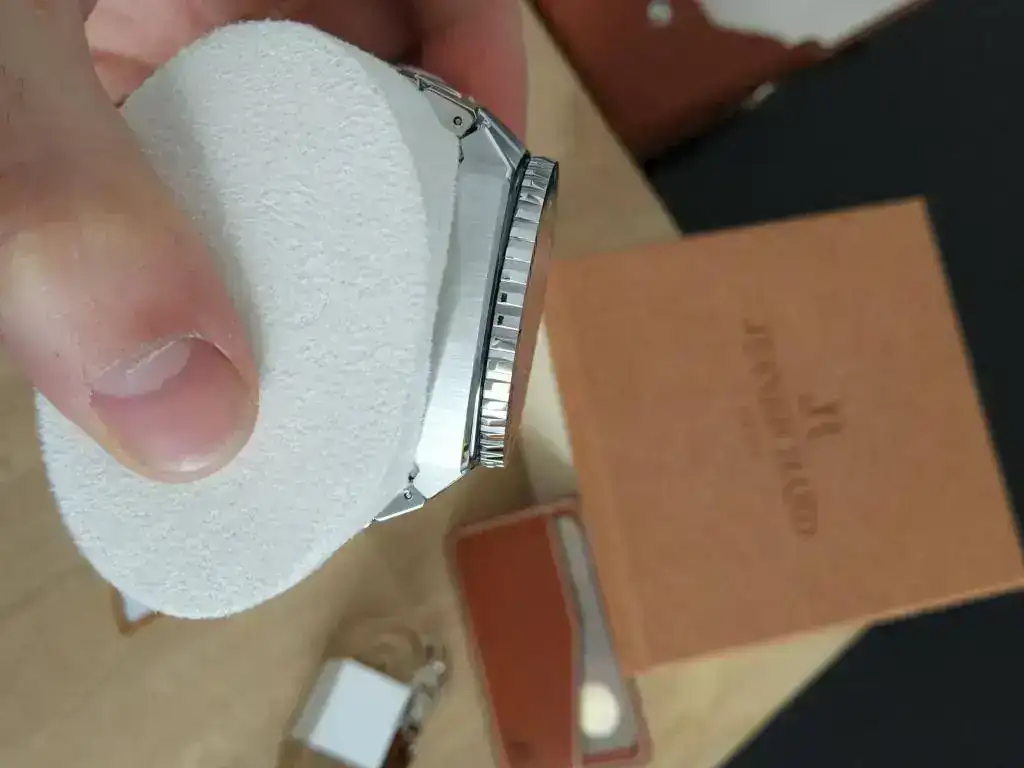 El brazalete es de acero macizo y es de los más cómodos que he probado. Sus eslabones son de un tamaño magnífico para poder ajustarse a todos los tamaños. Su cierre de tipo mariposa y queda semioculto al estar cerrado.