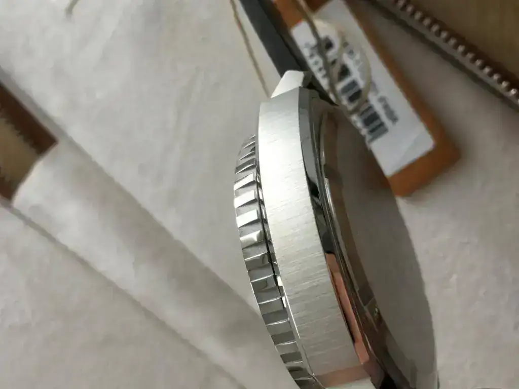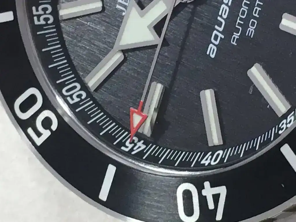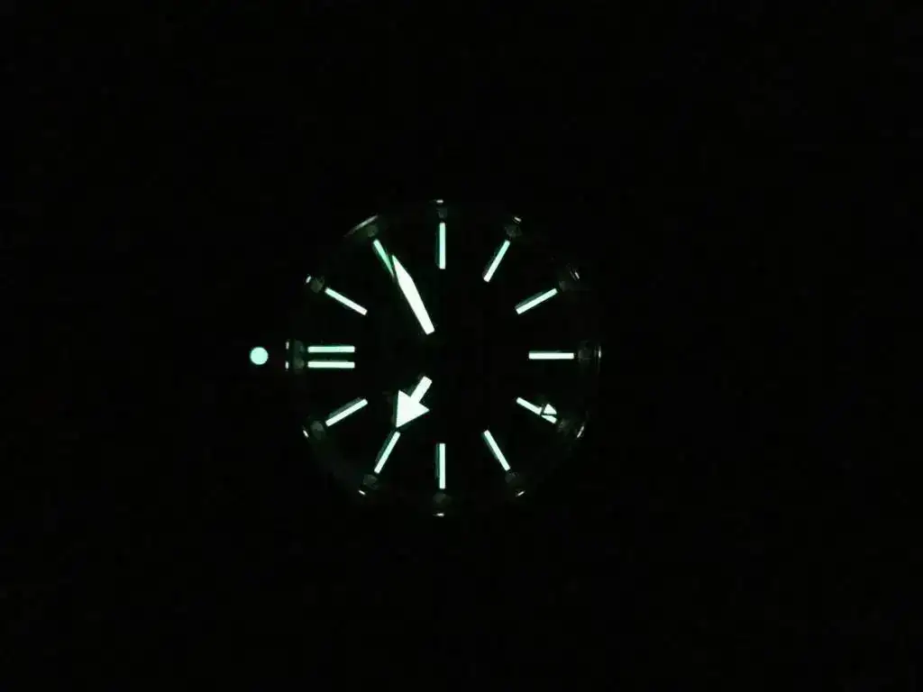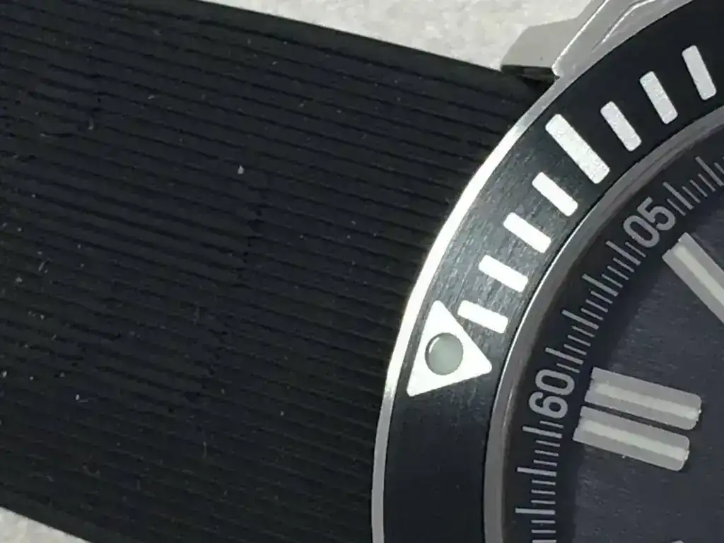 El bisel es realizado en acero con acabado negro matizado y una lectura impecable. Su estriado se encuentra pulido al detalle y presenta un tacto muy agradable y fácil de manipular. La perla con material luminiscente lo hace perfectamente legible.