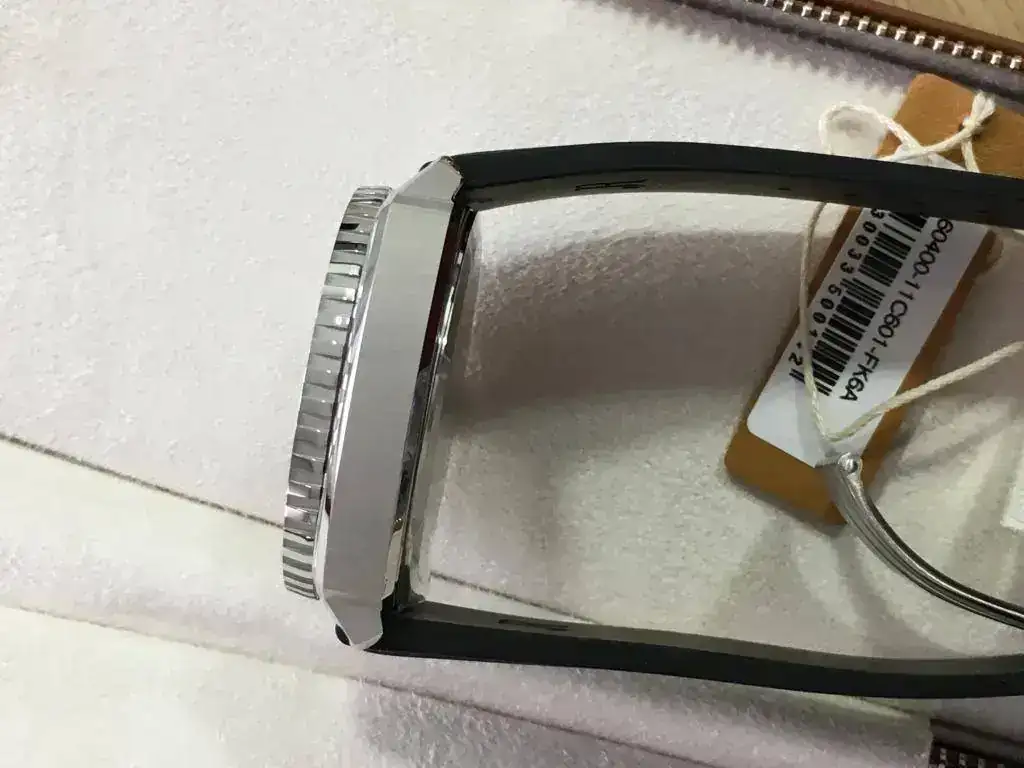 La correa de caucho es sensacional, de lo más cómodo que haya probado. Se trata de un caucho grueso, pero muy suave. Tiene la firma sutilmente reverenciada en su dorso. Acabada con un cierre desplegable de la misma calidad que el resto del conjunto, el cual es de acero y también se encuentra grabado con el nombre de la firma.