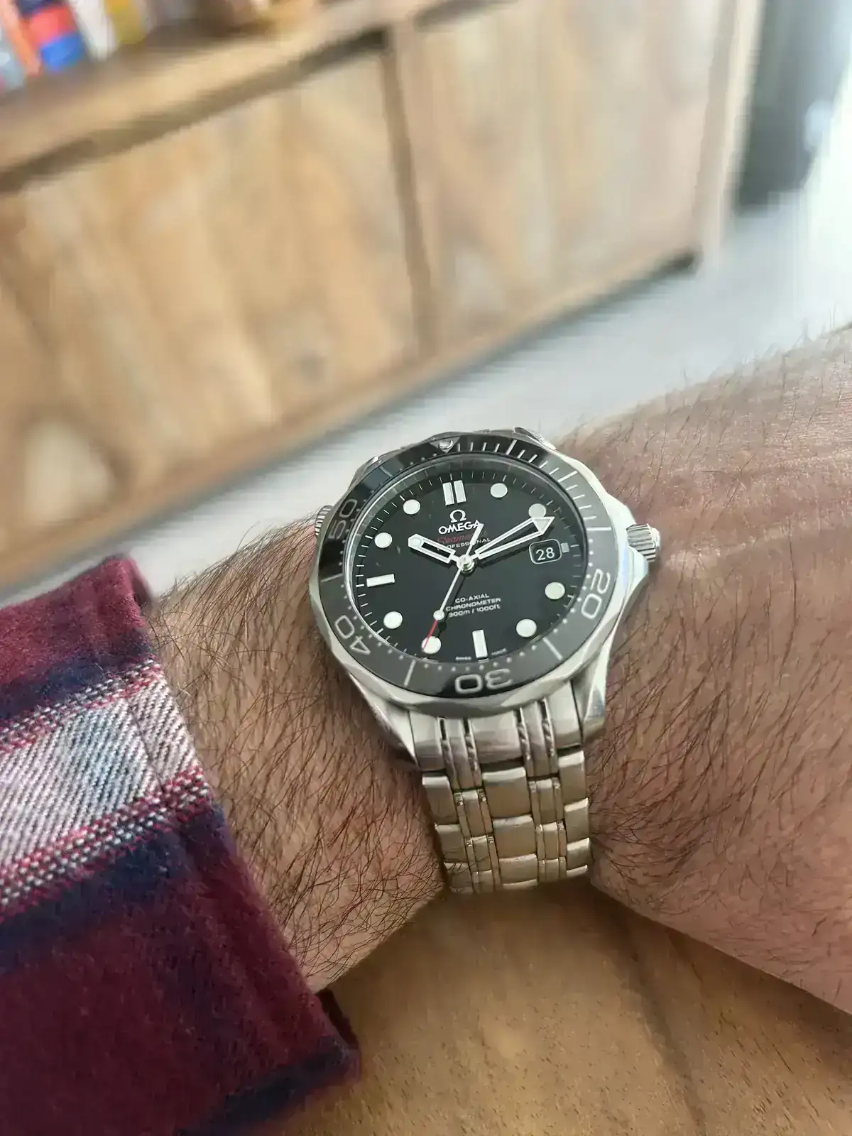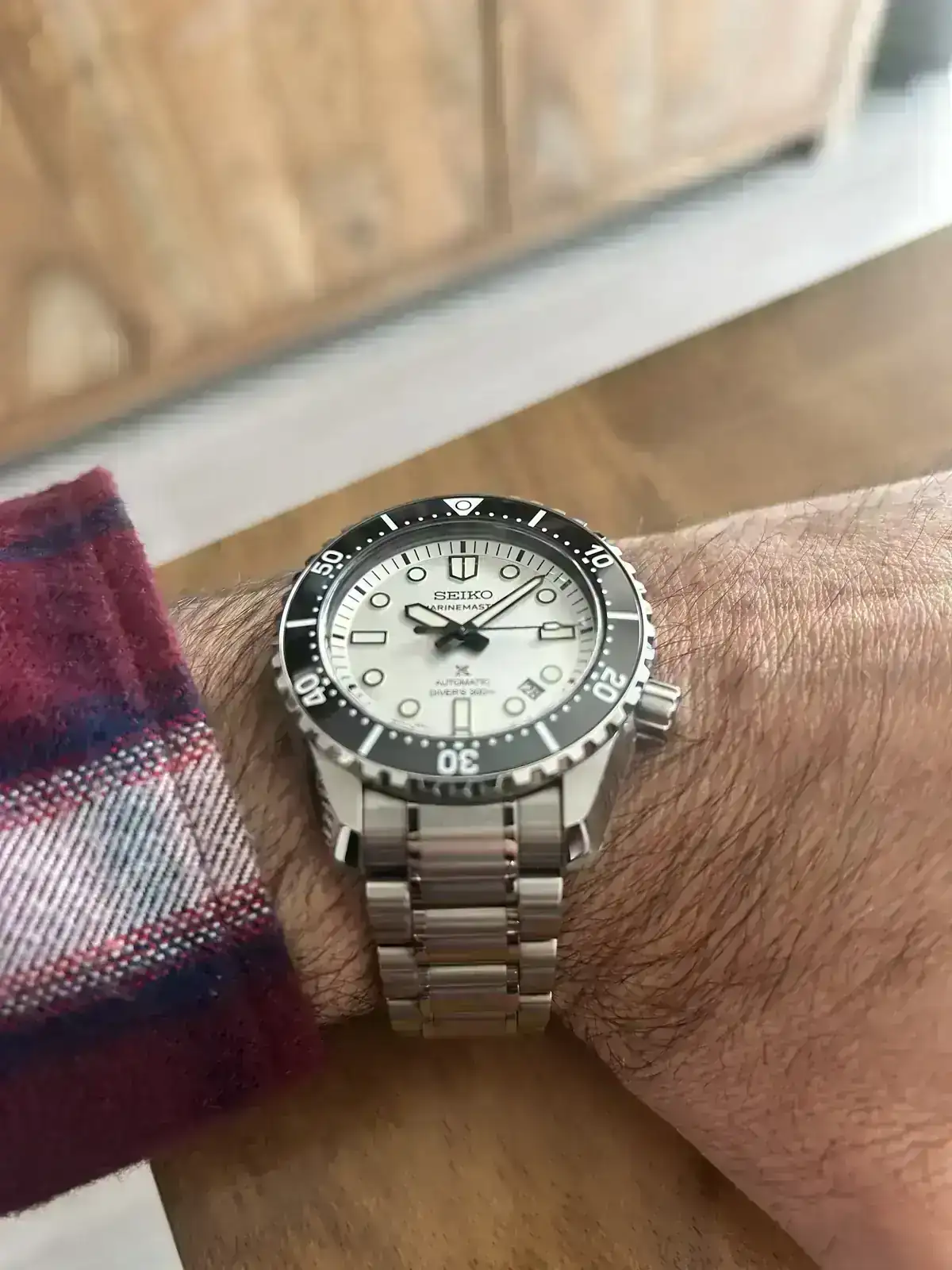 Perdón por el largo preámbulo. Yendo al lío, mi reflexión. Comparándolo con el Omega, mis sensaciones personales como usuario son estas, sin ser para nada un experto en la materia… quizás está un pelín por debajo el Seiko en cuanto a la sensación de refinamiento de la esfera, pero las agujas del Seiko de esfera blanca que es un plateado oscurecido son espectaculares. El bisel cerámico del Omega sin embargo le da mil vueltas al del Seiko, esos brillos grisáceos según le da la luz, El bisel del Seiko, no es súper ajustado en la posición de las doce, el bisel del Omega está mejor ajustado… Por otro lado, el lumen del Seiko por la noche le da mil vueltas al del Omega. Supongo que los 16 años de vida tienen algo que ver. En cuanto a sorpresas inesperadas, había leído comentarios negativos sobre los armis de Seiko, que mis impresiones son para nada negativas, me parece de muy buena calidad, peso, sensaciones… y sobre los movimientos. No ando midiendo las desviaciones pero no detecto retrasos ni adelantos perceptibles en ninguno. La maquinaria de ambos relojes me parecen súper fiable y es una pasada quedarse embobado mirando cómo el segundero va remontando. Supongo que la maquinaria de un Omega Chronometer Cohaxial debe ser superior aunque el vendedor de Seiko me explicó que el movimiento 8L35 es un masterpiece, pero para mí la verdad es que cualquier diferencia me resulta imperceptible. Pues eso, disculpas por el ladrillo de texto e intento pegar un par de fotos.