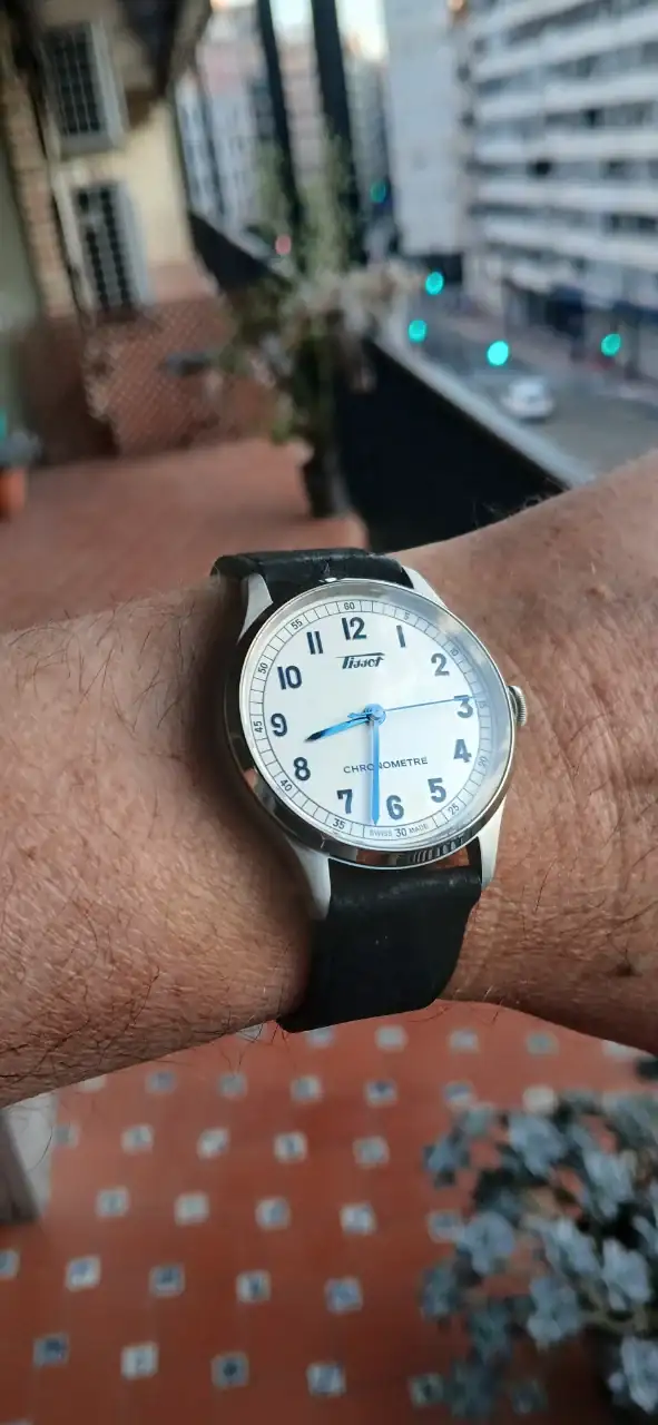 Ayer paseando vi en el escaparate este Tissot y me picó la curiosidad. Entré a probármelo y me gustó mucho puesto en la muñeca. Pregunté precio y me hacían descuento. Y se vino para casa. Desde que salió este modelo me gustó mucho su look neovintage que tanto me atrae. Las versiones negra y salmón por diversos motivos no me terminaban de encajar. Cuando salió este verano esta versión con la esfera blanca/plata y agujas/ números azules me gustó mucho, pero el factor corona con posición fantasma me frenaba comprarlo. También el tamaño de 39mm que está en el límite de mi ideal era un poco un motivo para olvidarme de él. Ayer cuando me lo probé mandé a la m.....mis objeciones de la corona fantasma y los 39mm. A su favor que el lug to lug es de 46mm. El texto de "chronometre" en las fotos me parecía muy grande, en la realidad con mi bresbicia ya no lo es tanto. Este reloj chronometro con eta 2824 por 750 eur es una ganga. Un saludo a todos.Ver el archivos adjunto 2928643