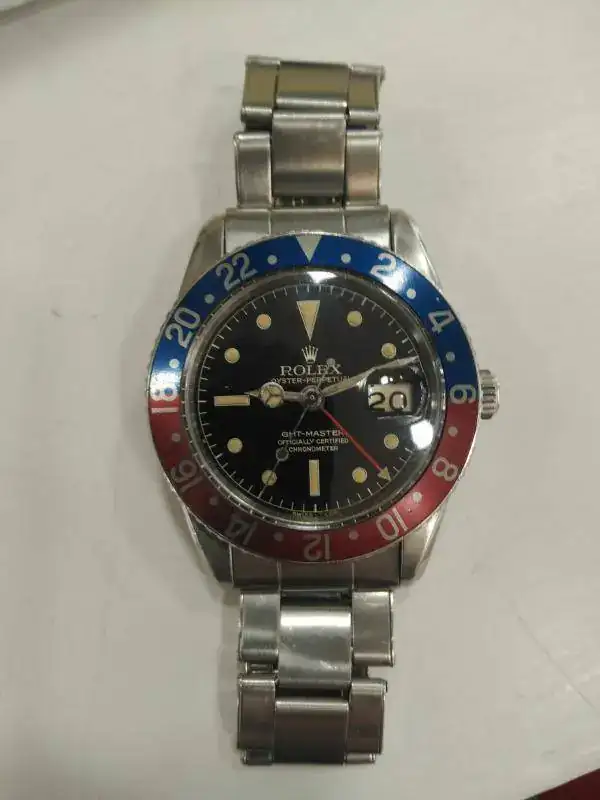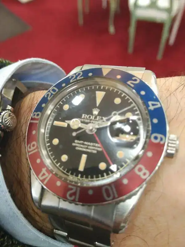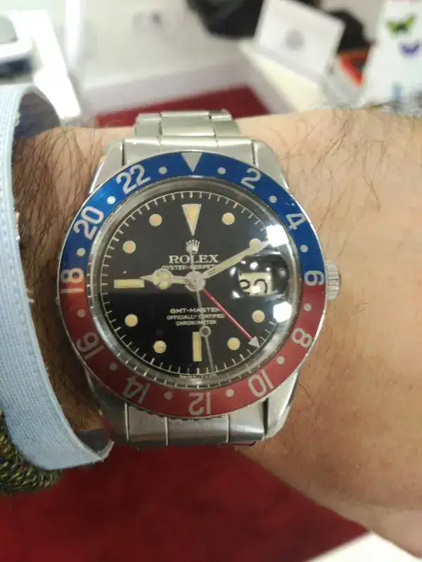 Digo: ¡No puede ser! Pero lo es, vaya si lo es. Un Rolex GMT Master referencia 6542, con bisel de aluminio (o sea fabricado a partir de 1956), en perfectas condiciones.