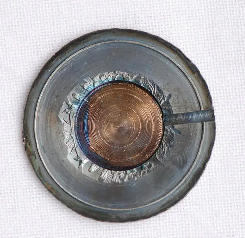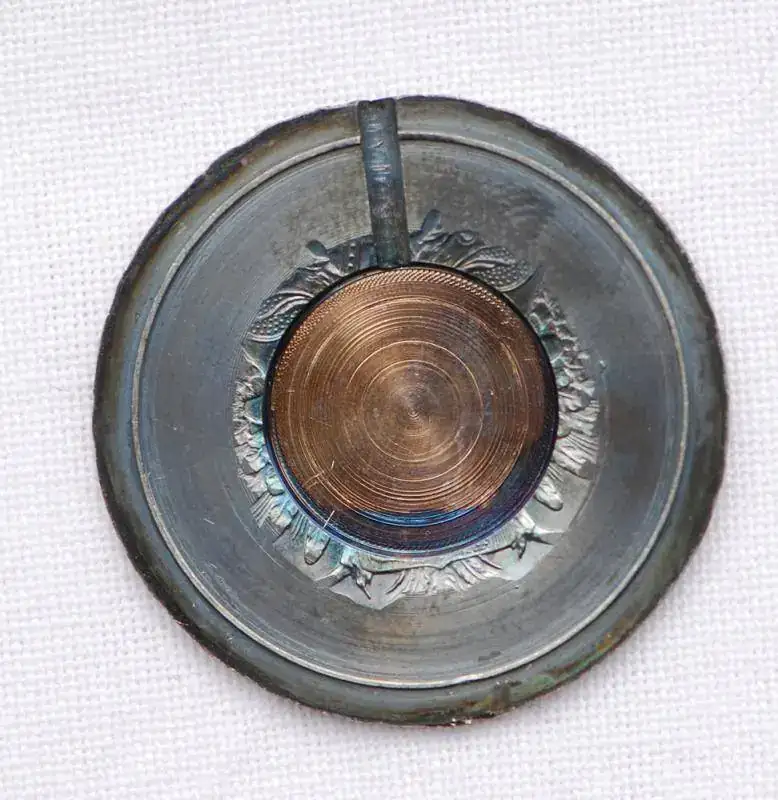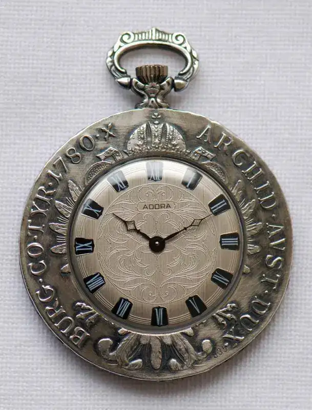 Reloj lepine suizo circa 1970, de la marca Adora encastrado en una moneda de plata. Esfera de plata con adornos florales y numeración romana, incrustada en el reverso dela moneda. Agujas tipo catedral.