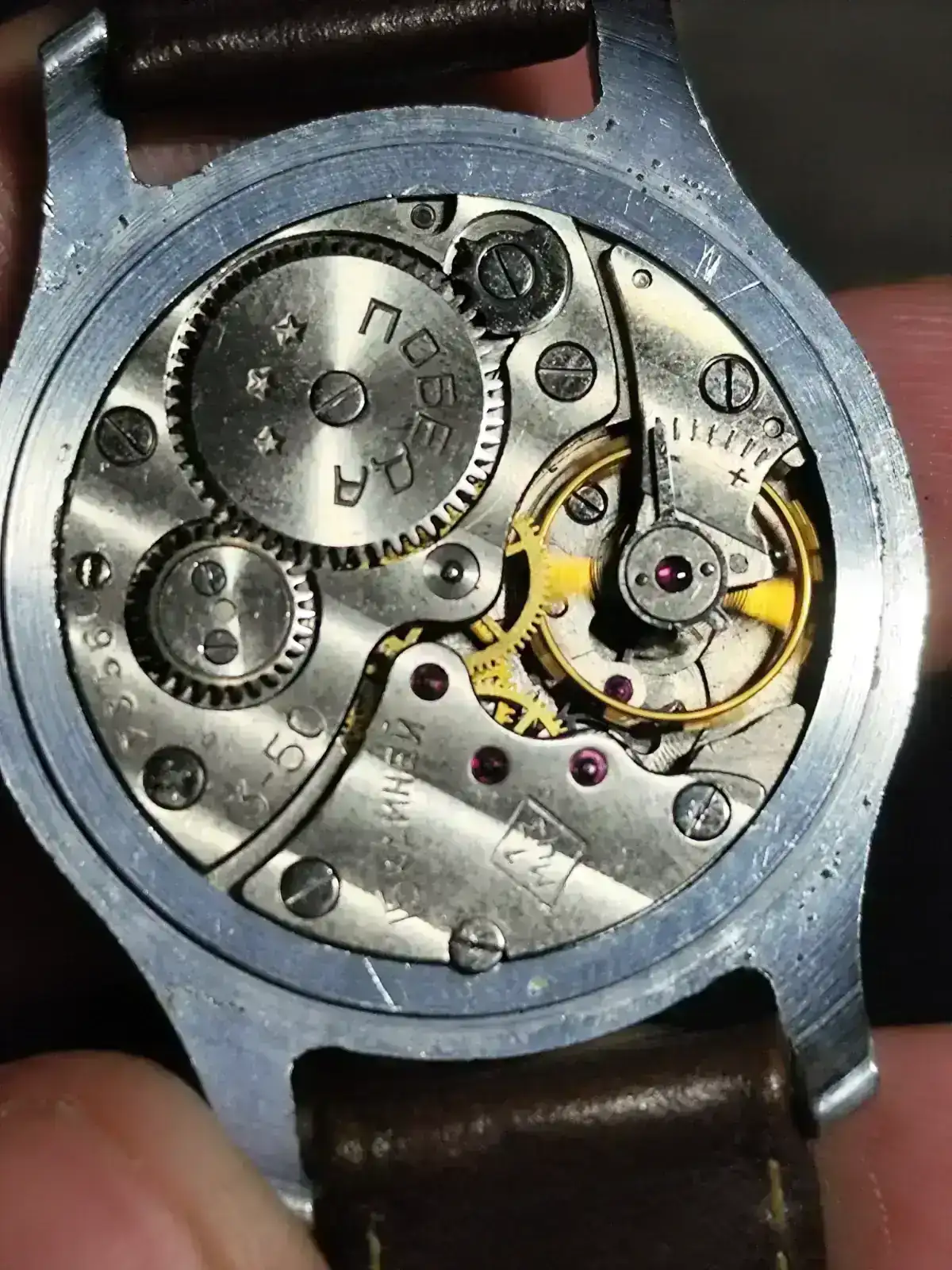 Buenas tengo este reloj Pobeda que me regalaron, según me dijeron tiene más de 70 años. Y publico esto para ver si me podéis dar alguna información más, por ejemplo donde se hizo, año exacto,que material es, calidad..., está impecable, menos el plex que tiene un par de rayas todo lo demás está impecable. Aquí pongo las fotos de la maquinaria y del reloj
