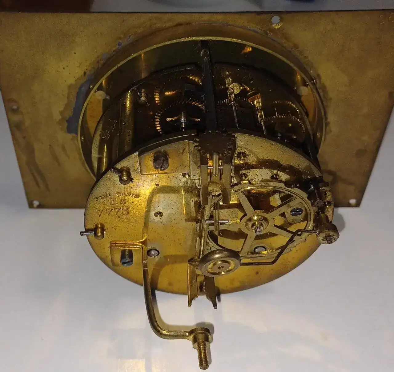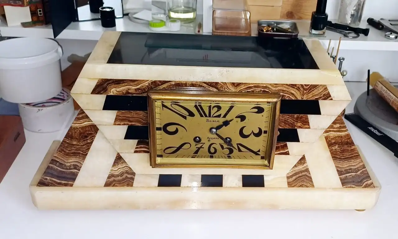 Estoy limpiando un reloj del que desearía obtener de este foro más información. Adjunto de entrada varias fotos. En el mecanismo está marcado "FINI PARIS J.S" ¿Es el fabricante? En la esfera está escrito Besle Auxerre, ¿Sabéis dónde puedo conseguir más información? Y la pregunta que me lleva de cabeza, ¿Sabéis de algún libro que trate el sincronismo marcha-soneria de estos mecanismos? Siempre consigo que funcionen pero después de muchas horas de prueba error y lo último ha sido que una vez montado dentro de la caja de mármol se comporta diferente de cuando está fuera en un soporte de trabajo. Os agradeceré cualquier información asobre este reloj, muchas gracias.