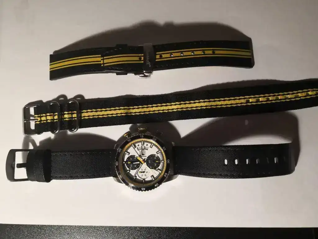 Lo vendo con la correa de nylon nautico que lleva montada, la nato recortada de origen y la de piel tambien original.