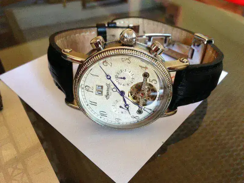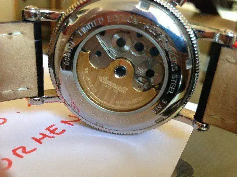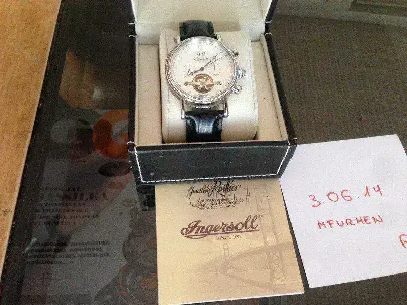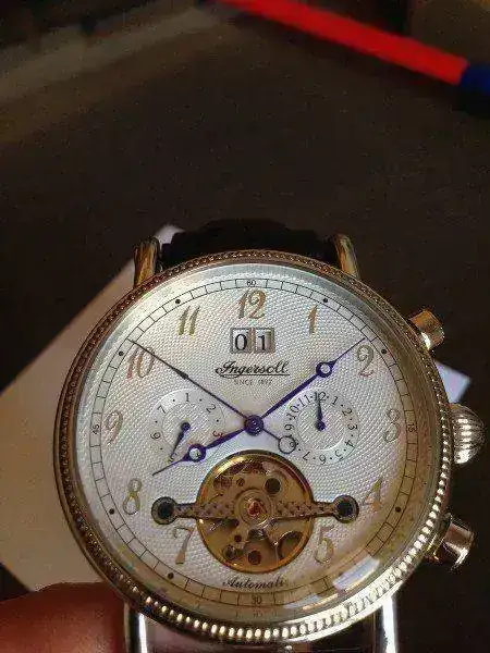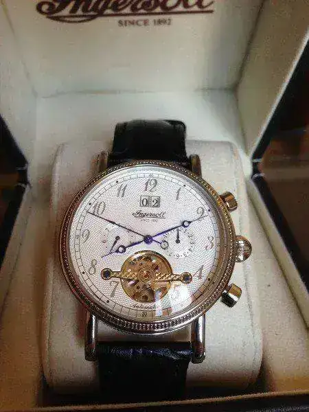 Esta vez saco a la venta este espectacular Ingersoll Richmond, en un estado excelente como podéis ver, a pasado el 98 % de su vida en una caja expositora, a destacar que como se ve en las fotos perdí un tornillo de uno de los lados de los pasadores y en una óptica me pusieron el que veis, nunca me he preocupado en ponerme en contacto con la casa para un repuesto ya que apenas te das cuenta una vez puesto y tienes que compararlo con el del lado opuesto para caer en la cuenta. La correa tiene prácticamente todo su vida, simplemente a destacar un agujero extra para mi muñeca de 17. He de deciros que la caja original del reloj esta algo estropeada, no se el motivo ya que la he tenido en un armario sin tocar...