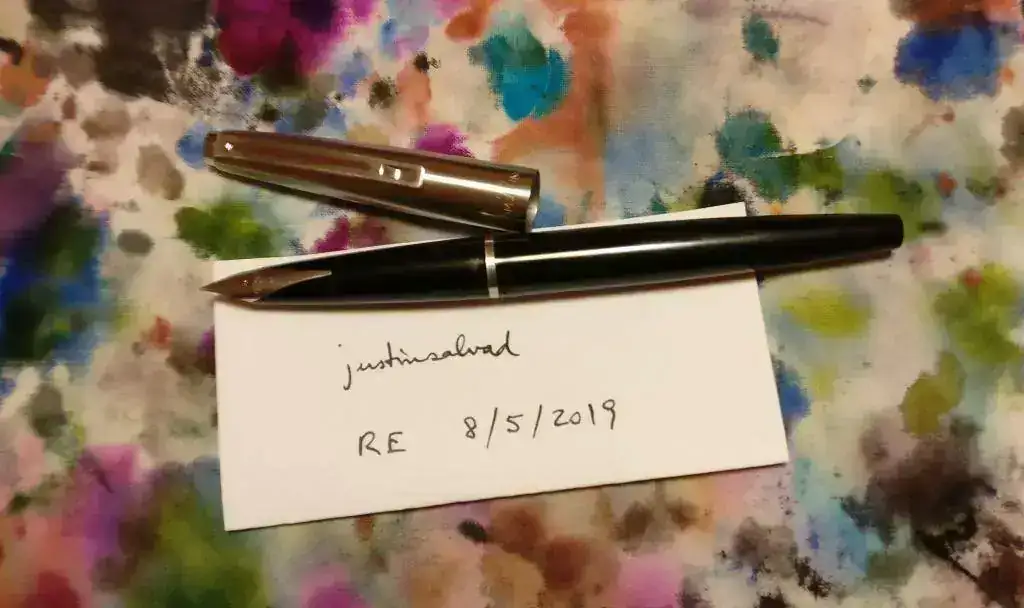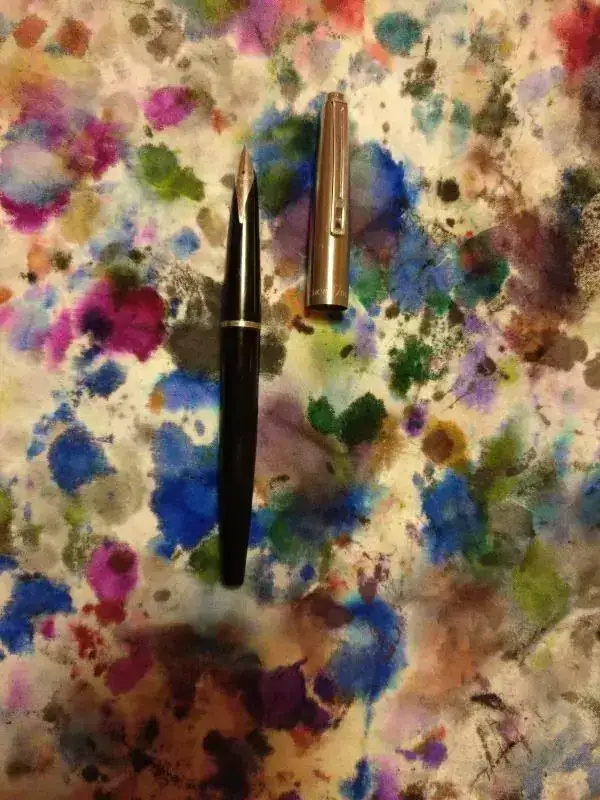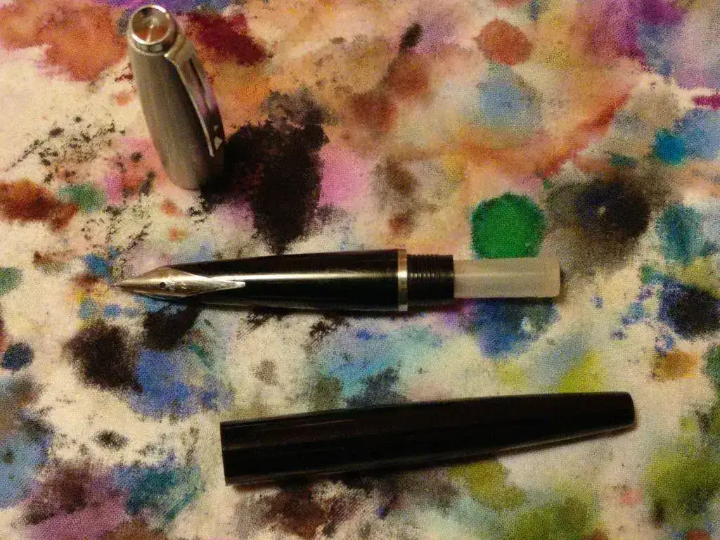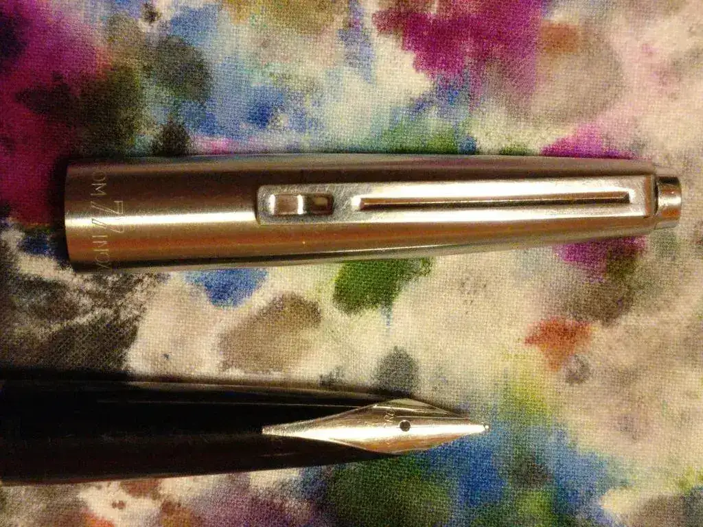 Pongo a la venta está Inoxcrom 77 gruesa con plumín inlaid (tipo Sheaffer) que presenta dos cortes laterales en sentido longitudinal. El tapón tiene forma cónica.
