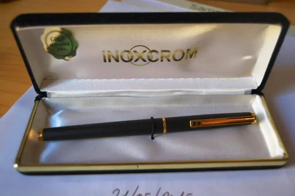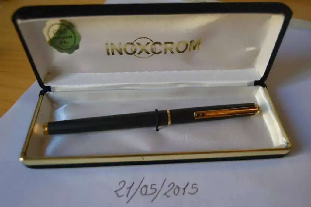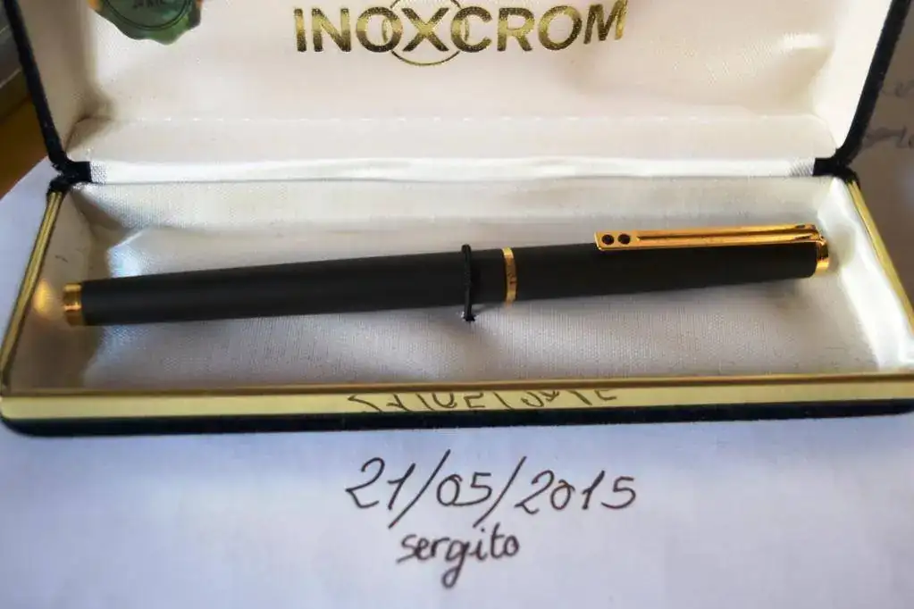 Pongo en venta esta Inoxcrom 77/Marbella. La pluma está usada por mí un par de veces pero antes de eso no se ha usado, porque la compré yo hará en julio un año, así que la pongo a la venta por 25€ con la caja de terciopelo que se ve en las fotos que es negro.