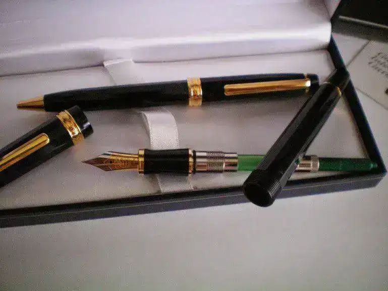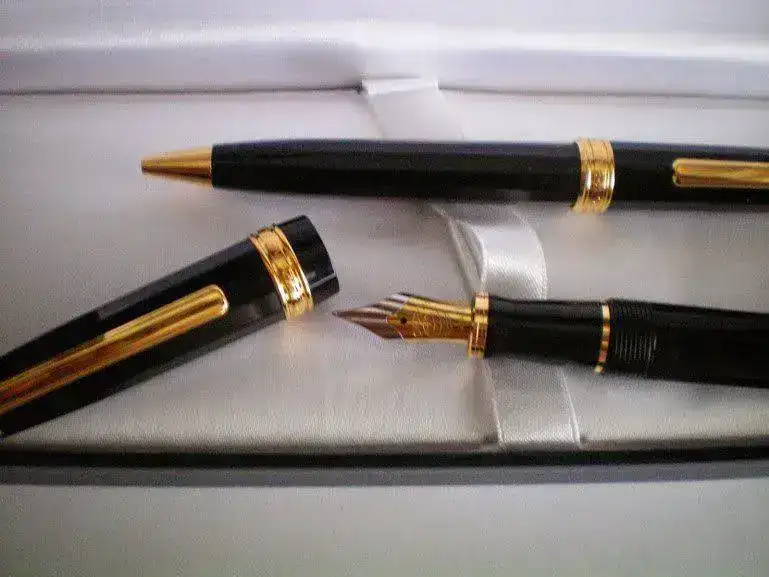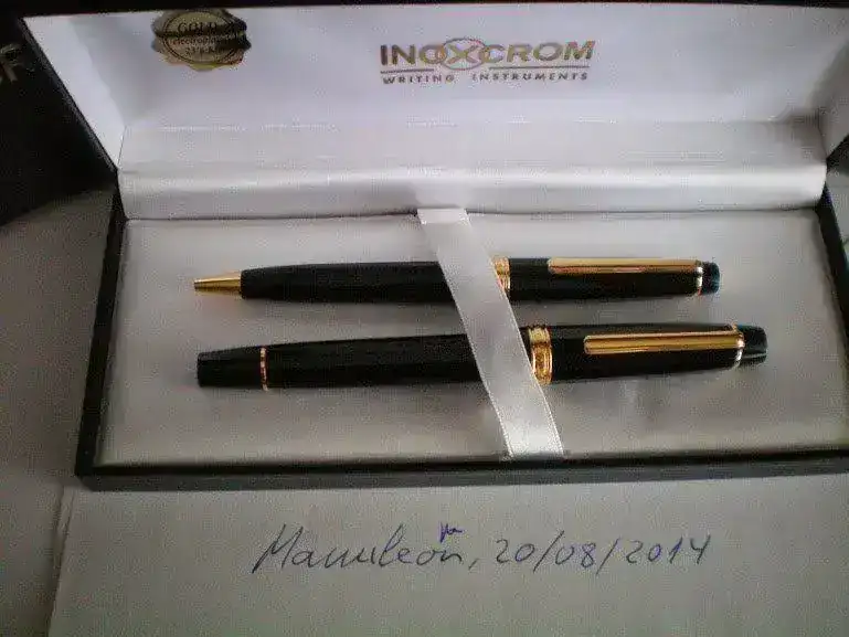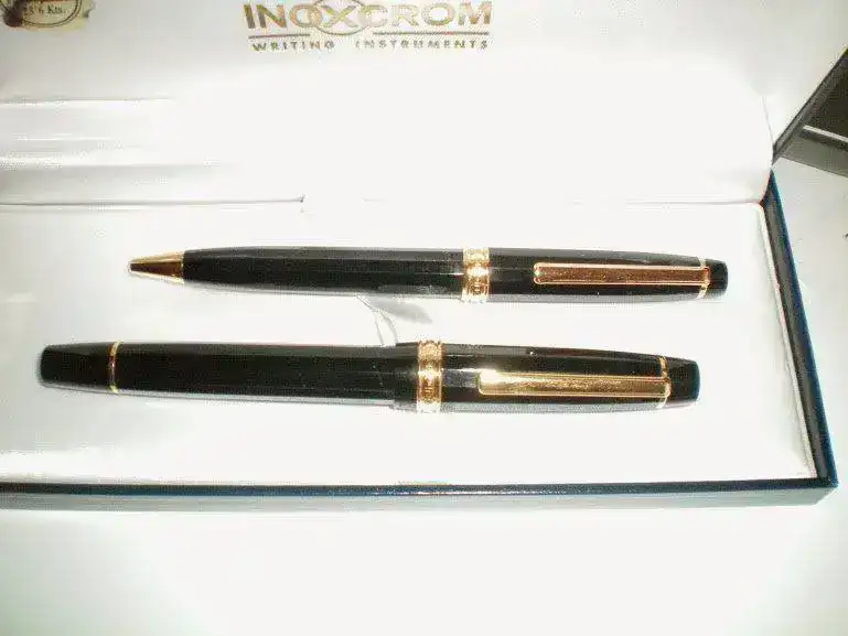 La estilográfica tiene una carga, se limpió y no se ha vuelto a utilizar. Con punto "M", es una pieza de sobra conocida y está en perfecto estado. El bolígrafo escribe perfectamente. No se ha utilizado más que para comprobar que funciona.