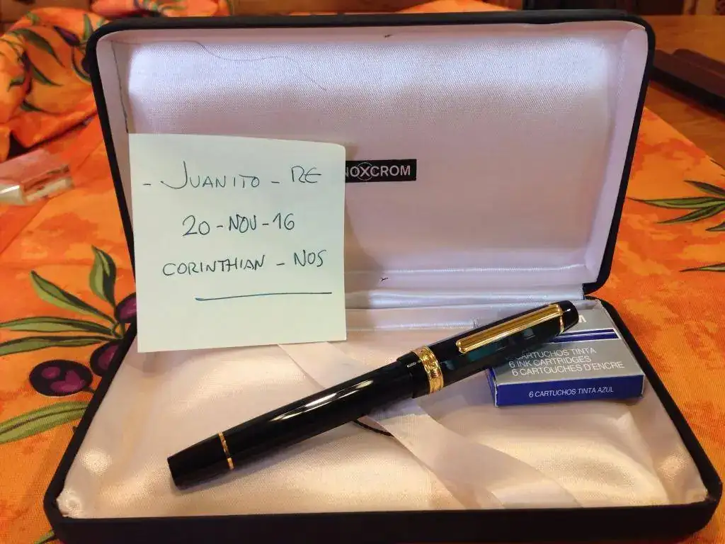 Lleva el cartucho vacío que trae de fábrica y uno lleno dentro del cuerpo. Además, añado una caja de cartuchos sin estrenar de tinta azul.