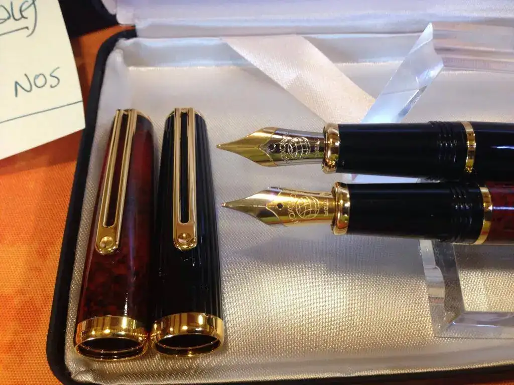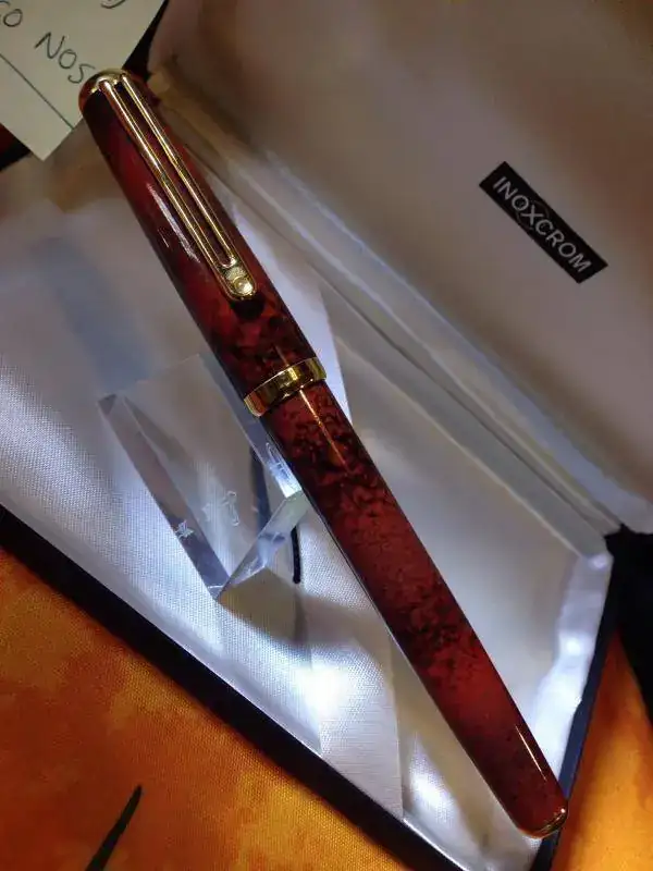 Una es la Sirocco Marble Red, preciosa, plumín M, acero bicolor.