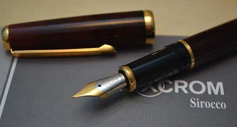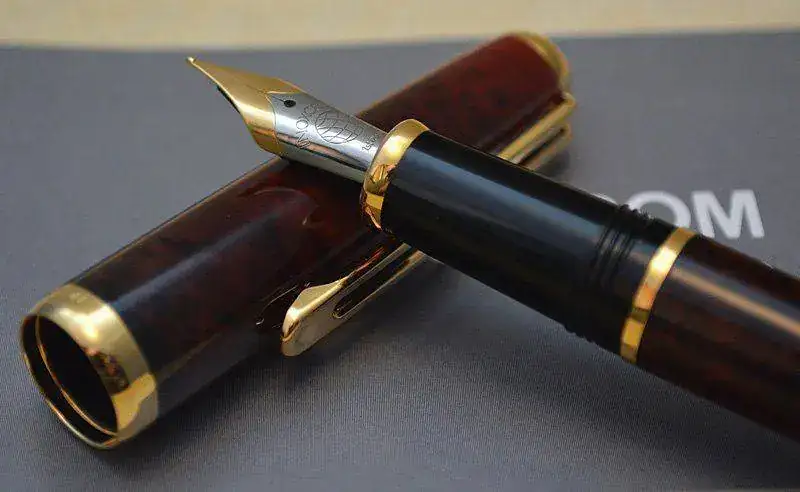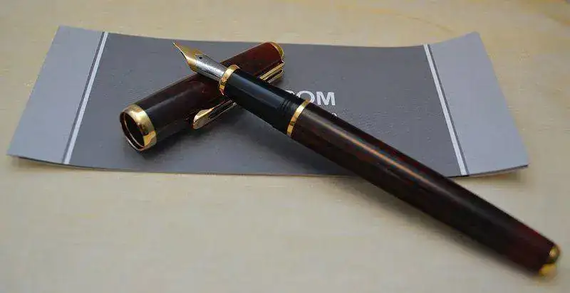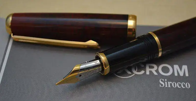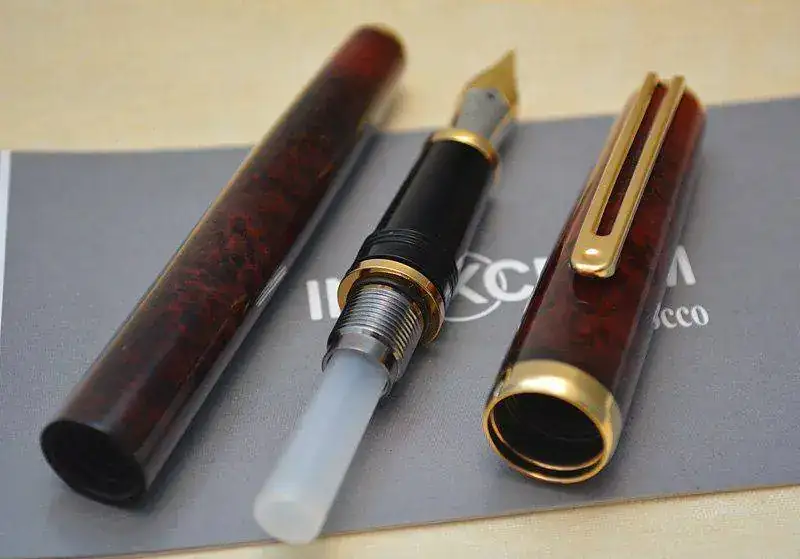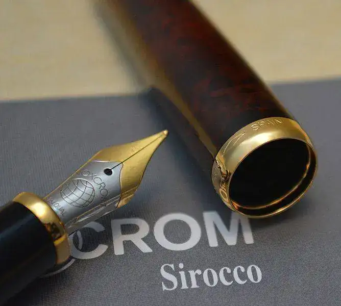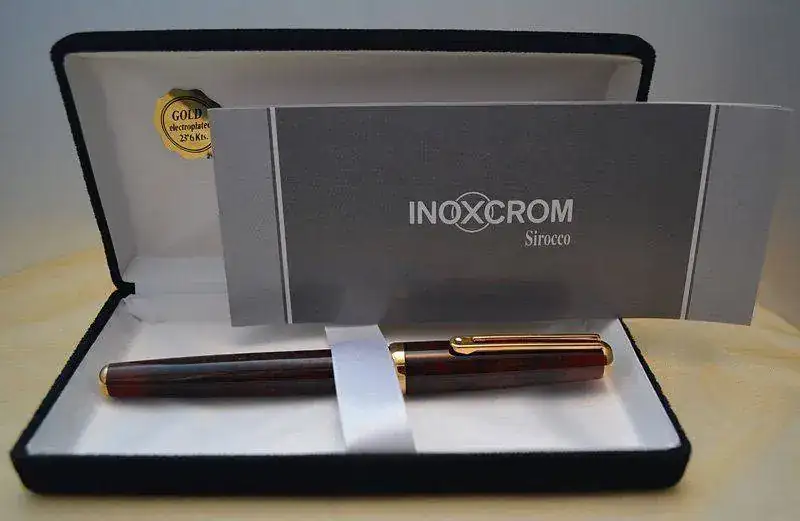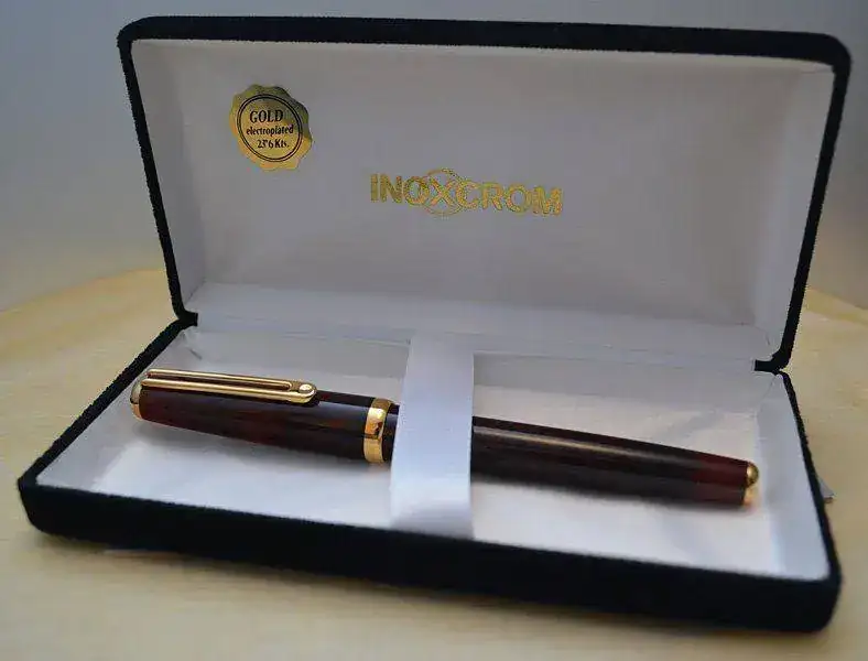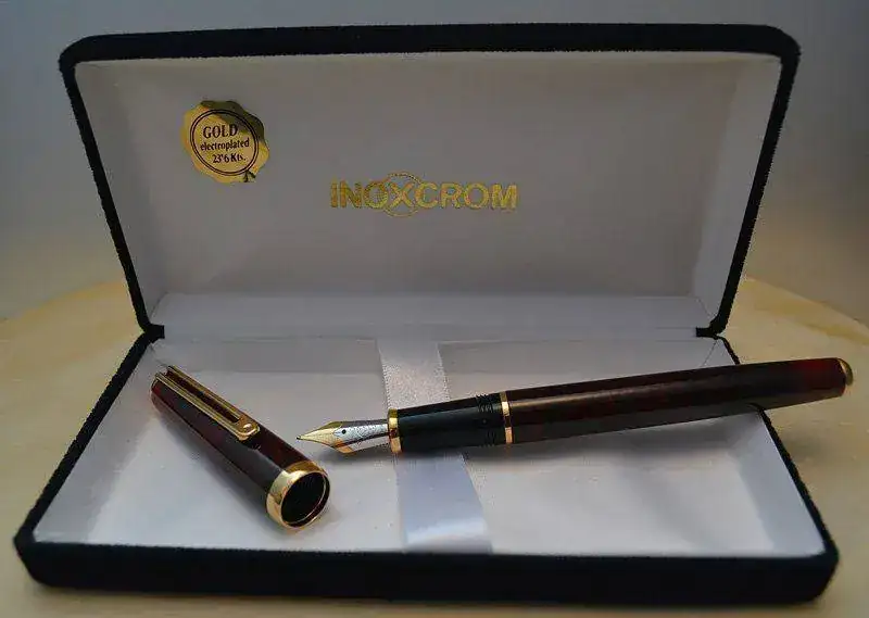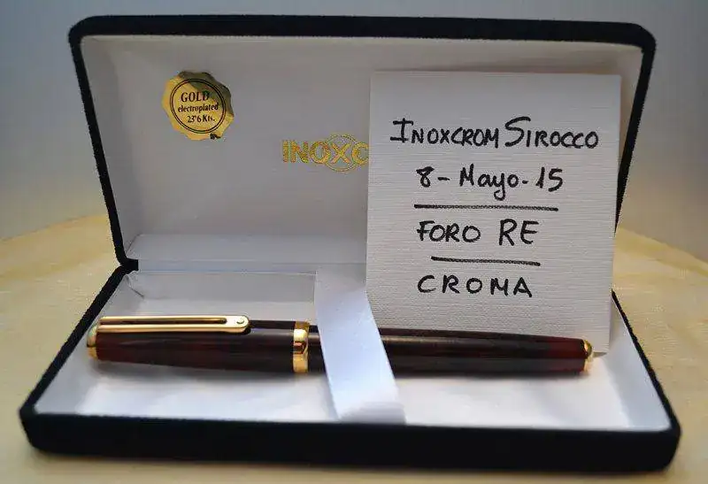 Ofrezco para su venta esta estilográfica Inoxcrom modelo Sirocco fabricada en España en resina acrílica lacada en color madera de brezo rojo-marrón con acabados metálicos chapados en oro. Plumín de acero bicolor de trazo M. Admite cartuchos y convertidor internacional (no incluidos).