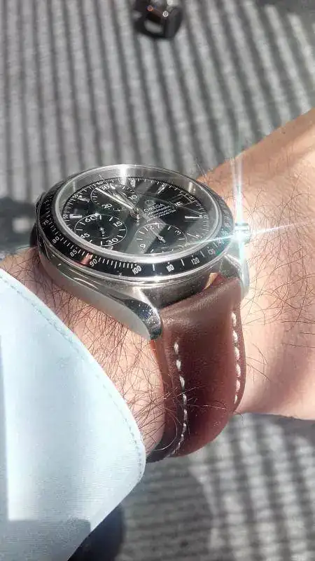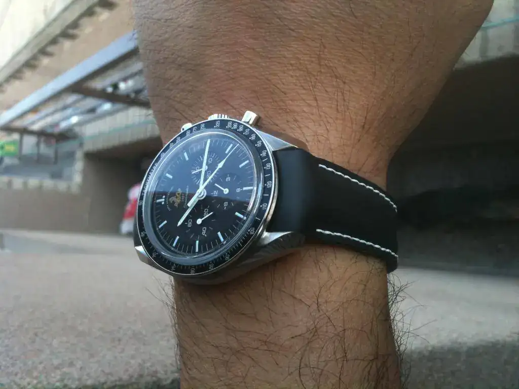 Siempre he pensado que lo que mejor le quedaría a mi speedmaster es un becerro de piel marrón oscuro. Que haria buen juego con la esfera negra. Sin embargo no se si es el marrón, que es demasiado claro o que al estar nuevo tiene apariencia "plásticosa" o no se que es pero no me convence....