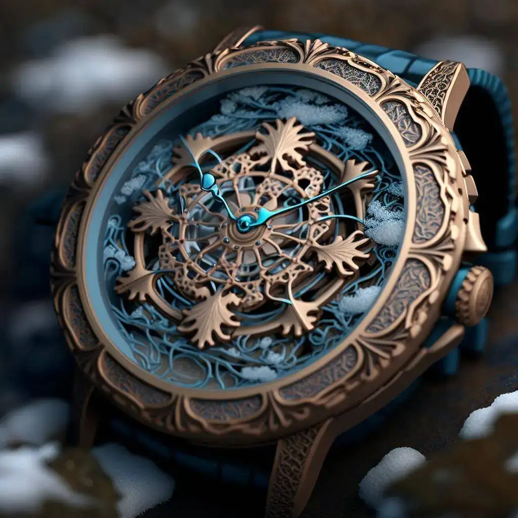 Lo que le pedí fue un reloj de bronce de lujo esqueletonizado, con colores bronce y azul. También puse la palabra snowflake a ver qué hacía, no ha puesto agujas snowflake sino que lo ha usado como inspiración general. Me parece muy chulo el resultado, francamente bonito, y 100% hecho por una IA, no he retocado la imagen en absoluto