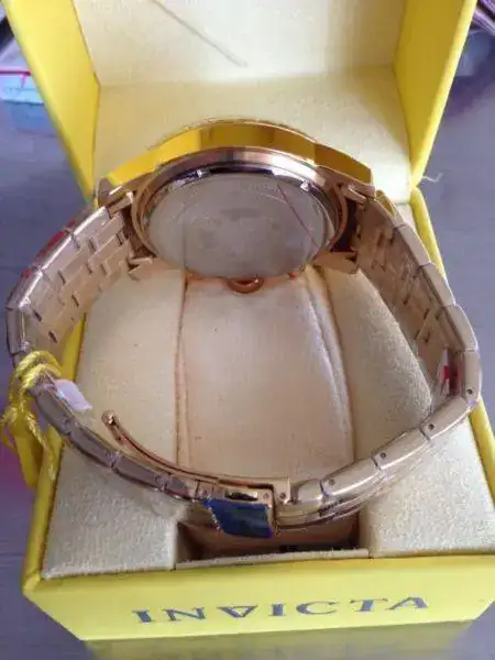 Y bueno en lo demás, parece ser un reloj robusto y duro aunque algo exagerado en sus dimensiones, bien al estilo que le gusta al público norteamericano, no sé qué más pensar... tiene una ligera tonalidad dorada que me da miedo que al cabo de un par de meses termine gastada por acá y por allá... considerando el precio, hasta llegué a sospechar que se trataba de una falsificación aunque el vendedor me explicó que los compra por ebay y los trae cada vez que viaja, allá son baratísimos. Me lo quiso hacer pasar por "relojes suizos de altísima calidad" pero bueno, no tenía interés en ponerme a discutir sobre el origen de la marca y menos sobre el origen del calibre jaja... me limité a decirle que me iba a asesorar antes de tomar una decisión.