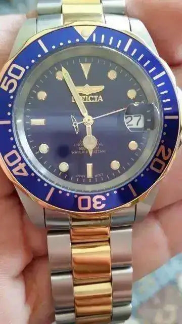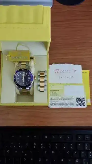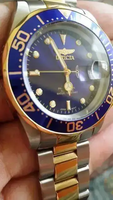 Saludos a todos. Vendo este Invicta en estado de reestreno absoluto, ya que solo tiene 3 meses y solo me lo he puesto una vez. No tiene ni una sola marca. Está impoluto. Este modelo lleva un calibre automático japonés, 24 joyas y remonte manual y parada de segundero. El cristal es mineral con antirreflejos. El fondo es roscado visto. Corona roscada. Caja de 43 mm. incluyendo la corona. Bisel unidireccional color azul y números dorados, así como la esfera, también azul. La correa es bitono, acero y dorada. El funcionamiento del reloj es perfecto. Va con su caja exterior, interior, garantía sin fechar, manual y eslabones sobrantes. El precio que pongo es de 120 euros, envío por cuenta del comprador.